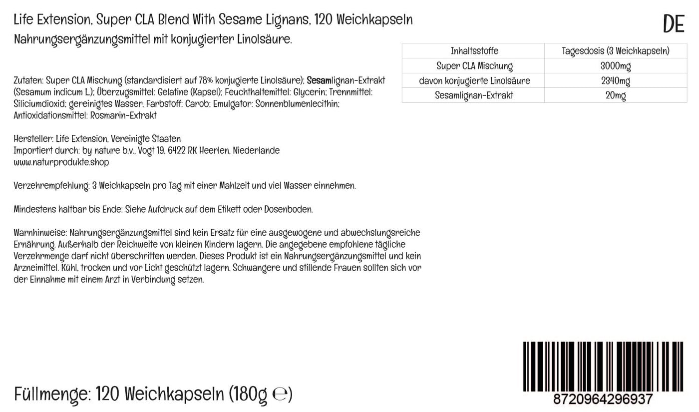 Product description The high-quality dietary supplement Super CLA with Life Extension Sesame Lignans contains high doses of conjugated linoleic acid. A daily dose of 3 soft capsules contains 3000mg of Super CLA mixture 2340mg conjugated linoleic acid and 20mg sesame lignan extract. Ingredients / Ingredients Super CLA Blend (standardized to 78% conjugated linoleic acid); Sesame lignan extract (Sesamum indicum L.); Coating agent: gelatin (capsule); humectant: glycerin; Release agent: silicon dioxide; purified water, Color: Carob; Emulsifier: sunflower lecithin; Antioxidants: Rosemary Extract P.when('A').execute(function(A) { A.on('a:expander:toggle_description:toggle:collapse', function(data) { window.scroll(0, data.expander.$expander[0].offsetTop-100); }); }); Instructions for use 3 soft capsules per day with a meal and plenty of water take. Warnings Dietary supplements are not a substitute for one balanced and varied diet. Out of reach of store for children. The stated recommended daily consumption amount may not be exceeded. If you have a bad reaction to the product, the product stop immediately. Please contact your doctor if you Want to use nutritional supplements and undergo treatment at the same time because of an illness or if you are pregnant or breastfeeding. More
