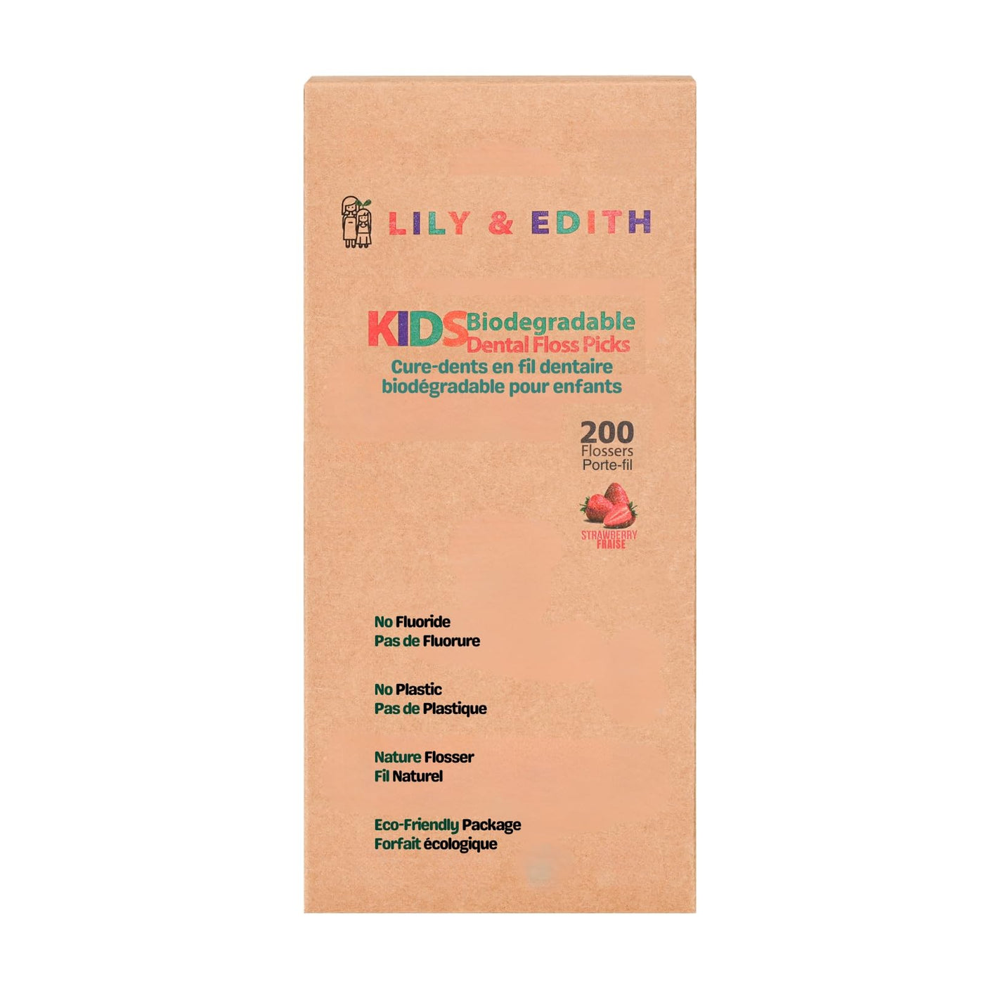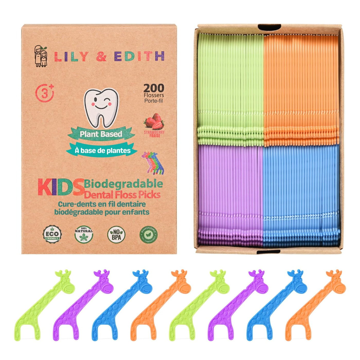 LILY & EDITH Kids Plant Based Dental Floss Picks 200 Counts, Fluoride Free, Corn Starch Material, Chemical Free, Fun Animal Flossing Sticks, Ultra Sturdy Thread, Zero Waste Package (Strawberry) Strawberry