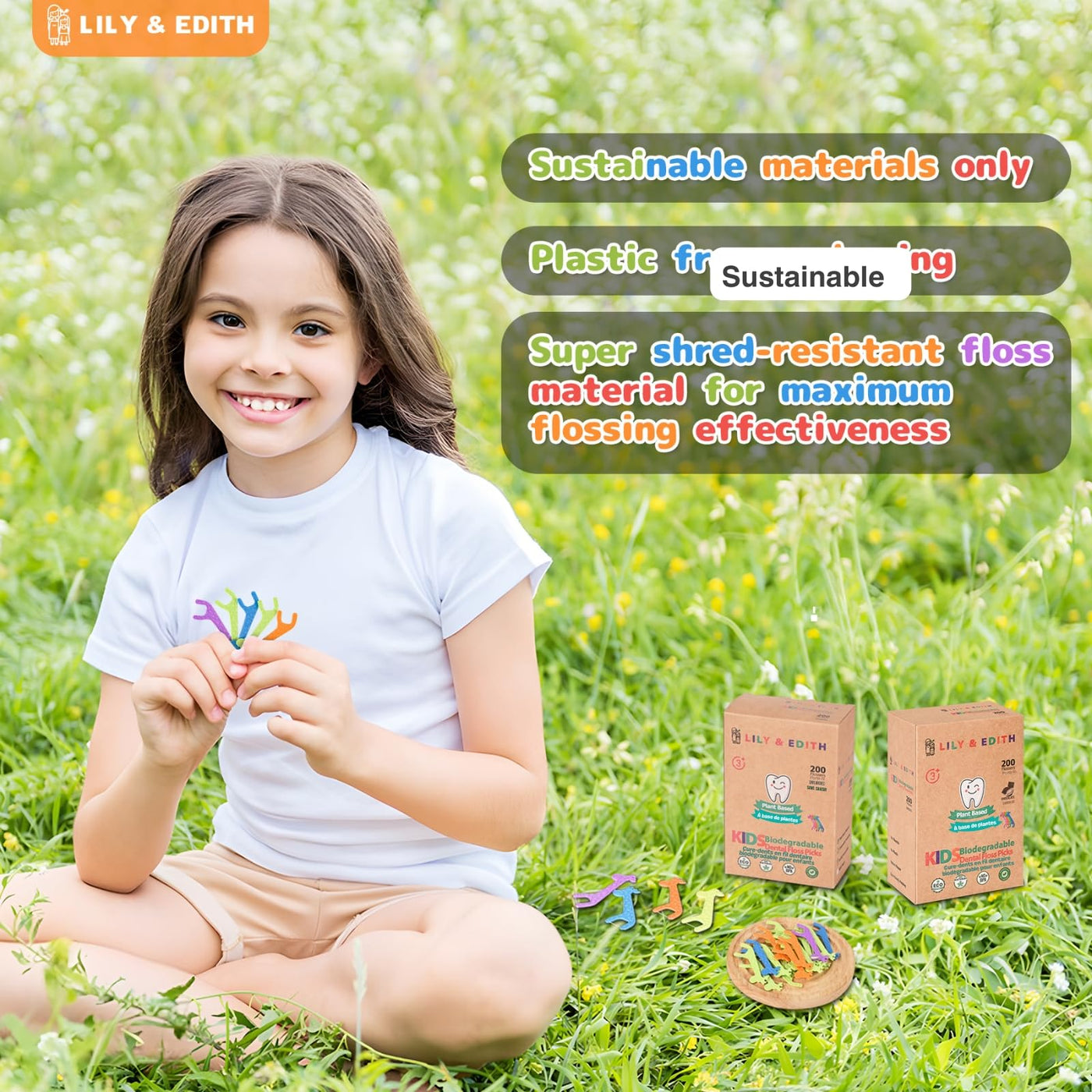 LILY & EDITH Kids Plant Based Dental Floss Picks 200 Counts, Fluoride Free, Corn Starch Material, Chemical Free, Fun Animal Flossing Sticks, Ultra Sturdy Thread, Zero Waste Package (Strawberry)