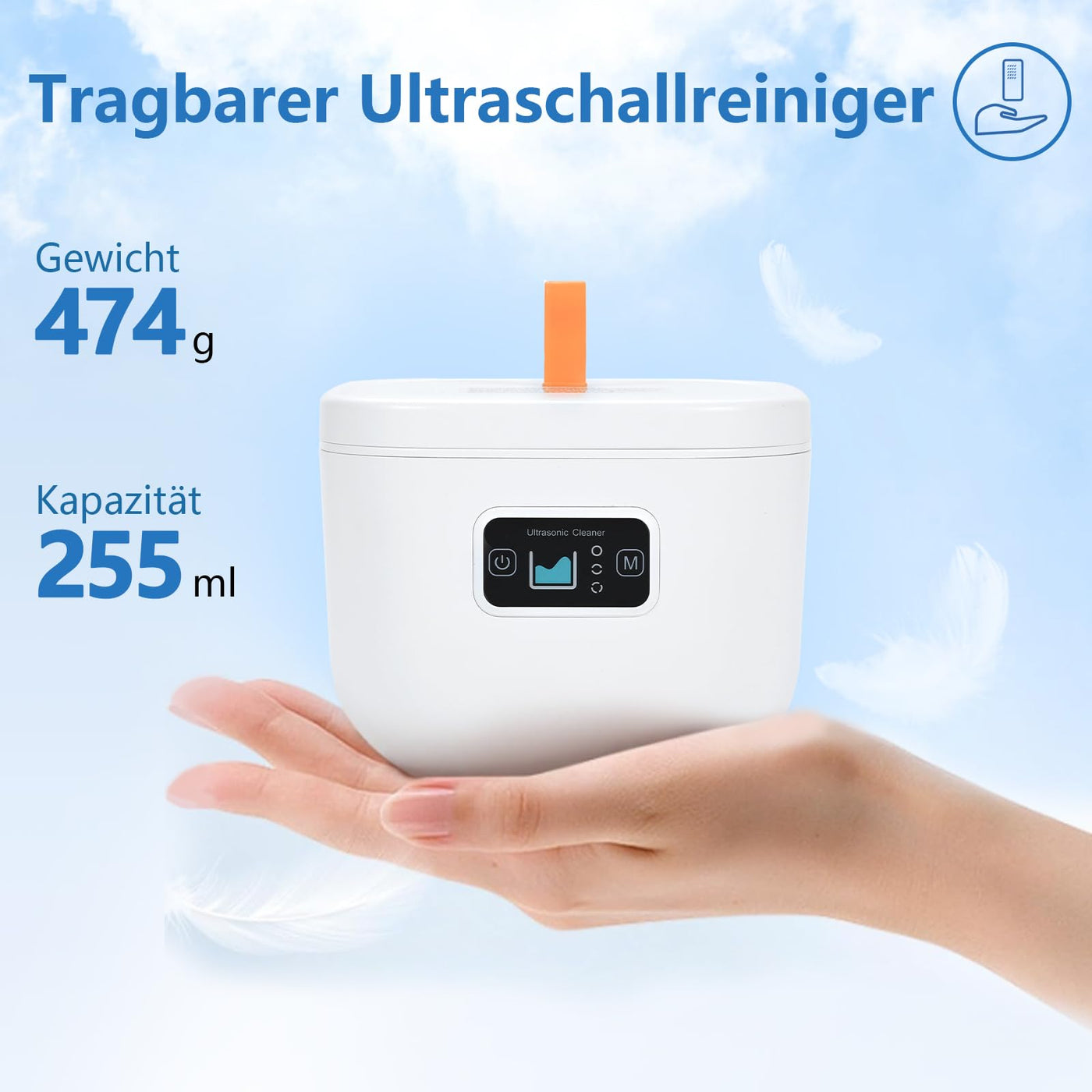 - PORTABLE AND EASY TO CARRY Our ultrasonic cleaner weighs only 0.47kg and has a maximum capacity of 255ml. The compact and lightweight design makes it easy to take with you when traveling. Whether you are at home or traveling, our ultrasonic cleaner ensures that your personal items are always clean.