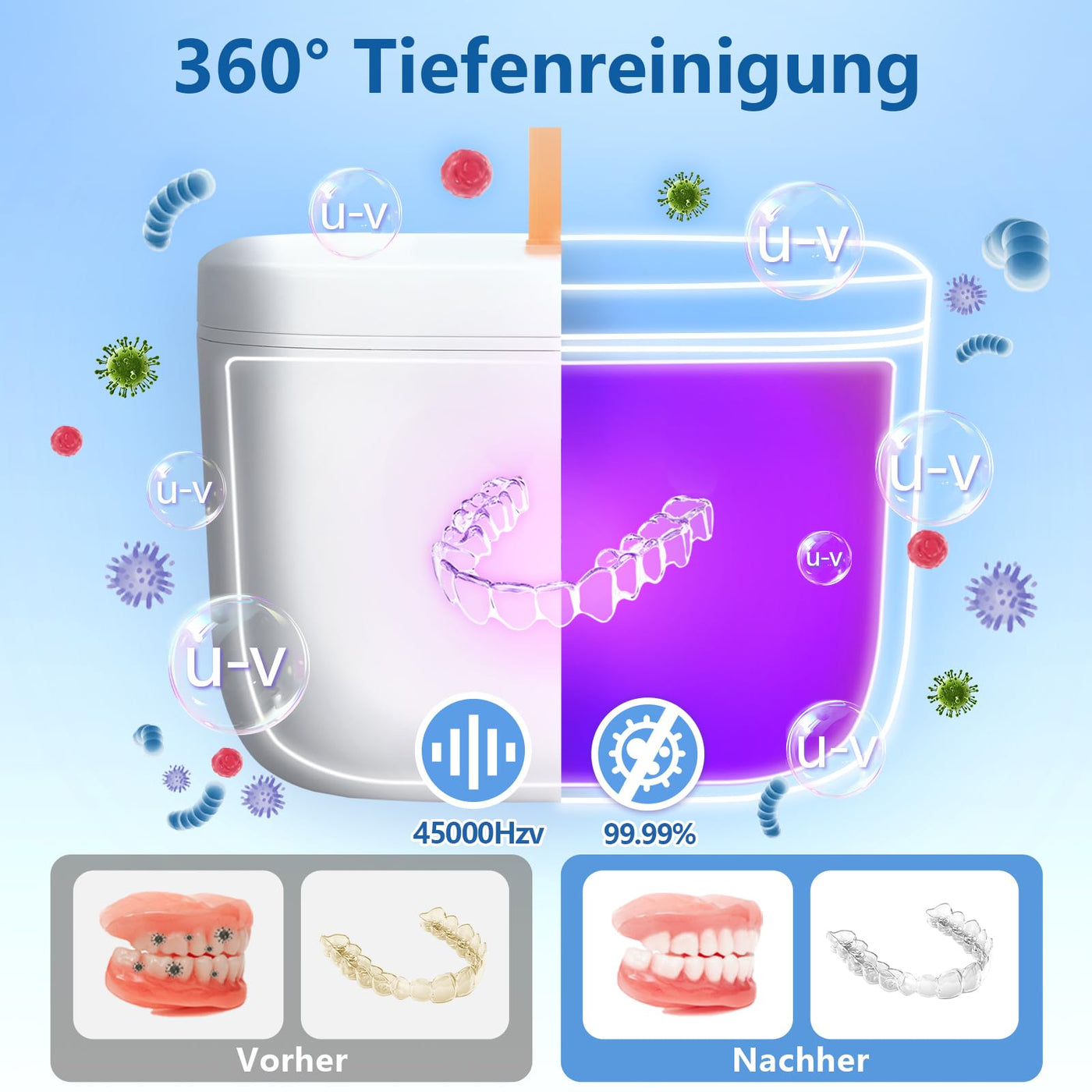 - HIGH FREQUENCY ULTRASONIC CLEANING Our ultrasonic cleaners have a frequency of up to 45,000 Hertz, allowing stubborn dirt and residue to be effortlessly removed. 360 degree penetration into hard-to-reach areas. Whether dentures, braces, night guards or jewelry and toothbrushes, it effectively removes surface dirt and tiny particles.
