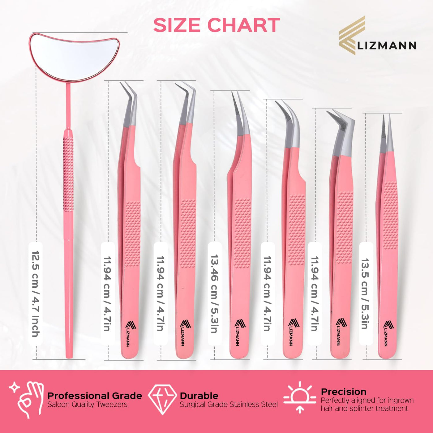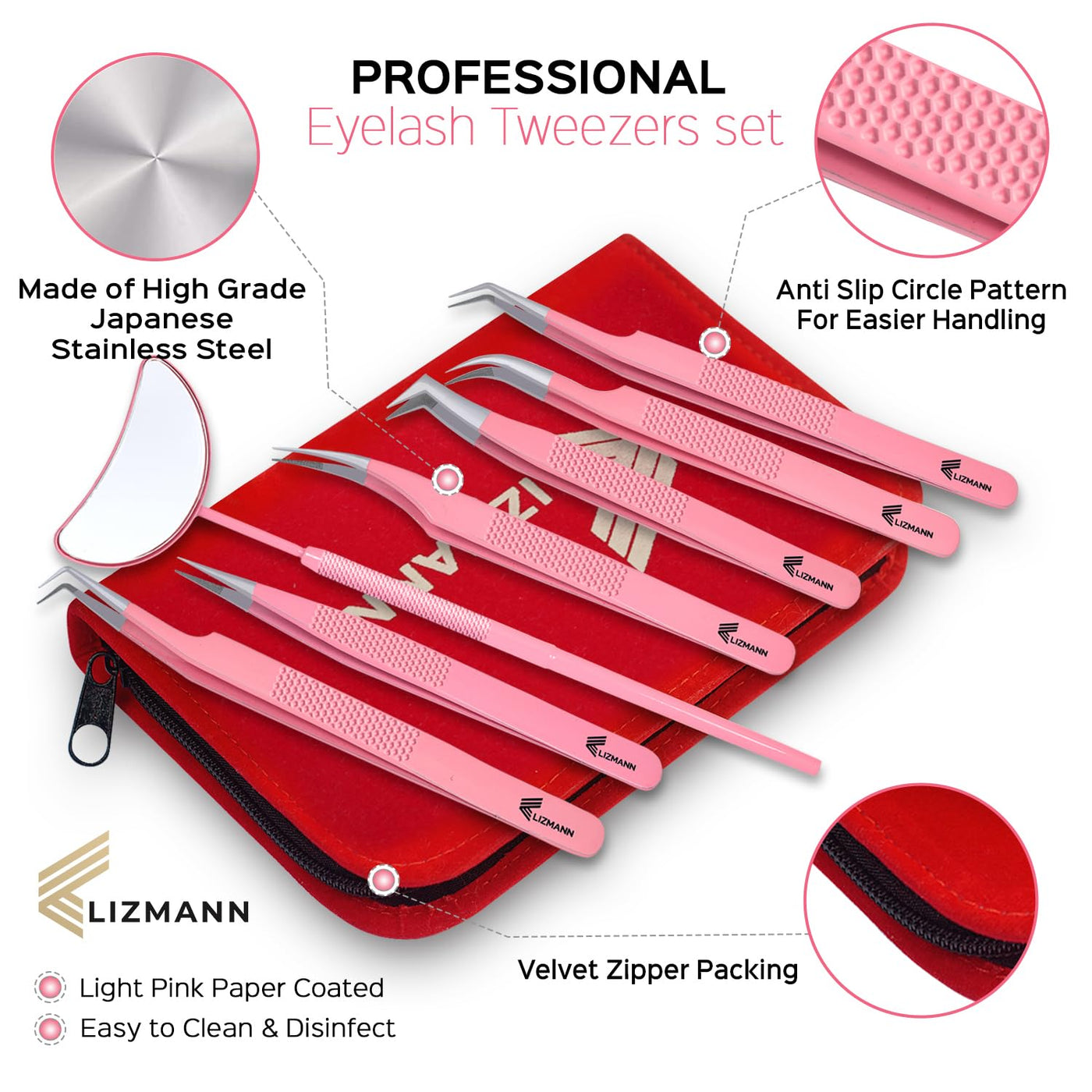 LIZMANN Eyelash Extension Tweezers (Pink Set of 7) – Professional Fiber Tip Lash Tweezers for Classic & Volume Lashes – Anti-Static Japanese Steel