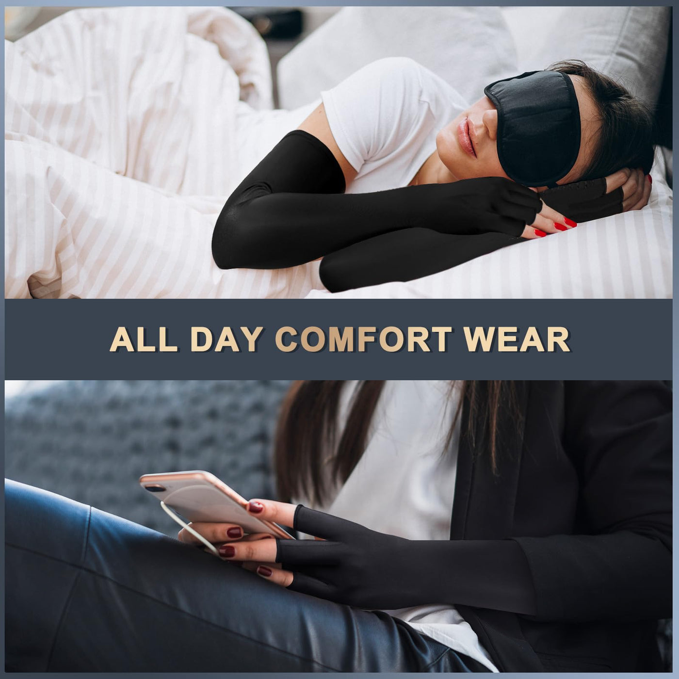 - SIGNIFICANT ADVANTAGE: Unlike other carpal tunnel compression gloves, Zuscot arm compression gloves are designed with extra-long cuffs to cover your wrists, forearms, and elbows, providing continuous relief and support. Sleeve length will reach 3-4cm above the elbow, not covering the entire arm. We intentionally tightened the fabric on the wrists and forearms to address the issue of insufficient pressure in these areas. The super stretchy fabric ensures easy wear.
