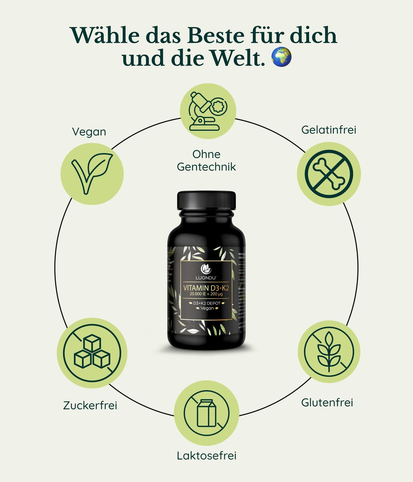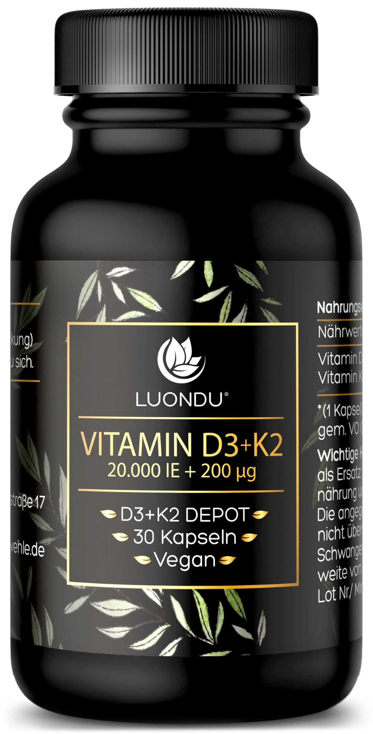 Luondu Vitamin D3 20,000 IU + Vitamin K2 MK7 200 mcg depot (high dose & vegan) high dose I without additives, made in Germany (30 capsules)