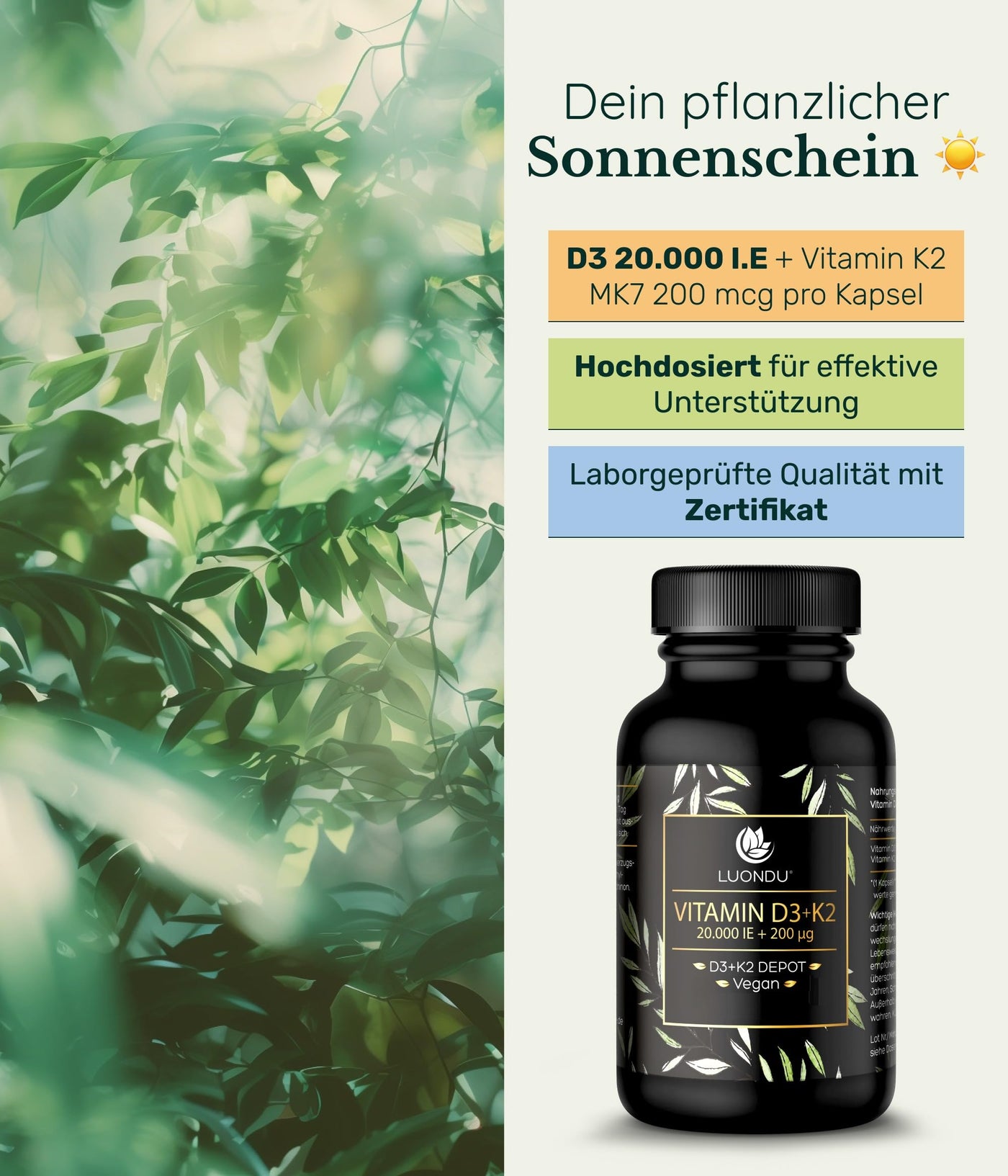 Luondu Vitamin D3 20,000 IU + Vitamin K2 MK7 200 mcg Depot (High Dose & Vegan) High Dose I No Additives, Made in Germany (30 Capsules)