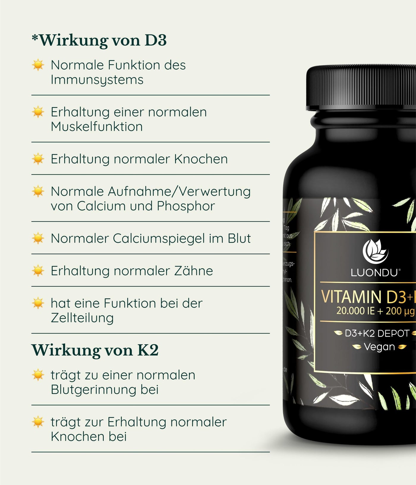 - HIGH DOSAGE OF D3 K2 PER CAPSULE: Only 1 capsule every 20 days for the guideline value of 1,000 IU vitamin D per day. If you have a vitamin D3 deficiency, we ask you to contact your vitamin D3 advisor or your specialist.