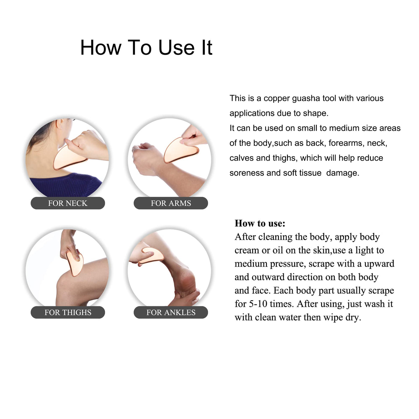 MagEnergy Gua Sha Tool Facial Copper Massager for back, neck, and shoulder.Scraping has been popular in China for a long time, which has a good effect on you if used correctly.(The copper GuaSha tools will tarnish over time. It is normal and doesn't change the copper properties.)How To Clean The Magnetic Copper GuaSha Tools?It Is Natural For Copper To Change Its Color And Leave Green Deposits On The Skin. This Happens When The Copper Reacts With Water Or Air, By The Process Called Oxidization, And This Is A Natural Process. The Green Deposits On The Skin Can Be Easily Washed Off With Soap and Water.Soak The GuaSha Tools In A Mix Of Water Lemon Juice Or Vinegar. Rinse The Bracelet With Warm Water And Dry Thoroughly With A Soft Cloth. Apply Tomato Ketchup On The GuaSha Tools. Rinse With Warm Water And Dry Thoroughly With A Soft Cloth.