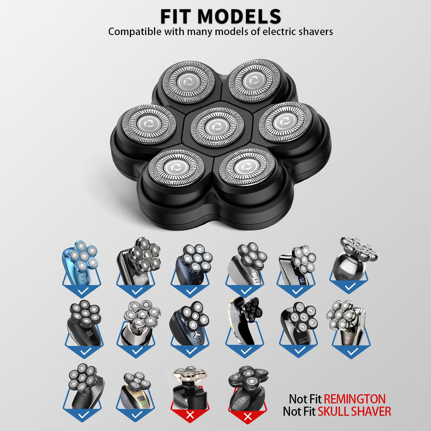 - [Compatible with universal Brands]:Head shaver replacement heads fit with most brands shavers that have 5/6/7/8 heads. Such as Free*** groom***, AidallsWell**, Vifyci*, SHPAVVE* ,AsaVe*, Aroama*, Rozi*, Roziap**, Roziahom*, Everfu*, Vsmoot*, OriHe*, WOOPOW**, Tiklea*, PaiTre*, SEFO*, Telfu* ZumY*, YEMIUG*, SKE*, Upmor*, MANL*, Asome*, ELECTRFIR*, GOOLEE*, CHI*,kense*,Kib*y and so on. PLEASE check the buckle slot or base of your shaver before ordering.(The replacement heads NOT fit Skull shaver, NOT fit Remington)