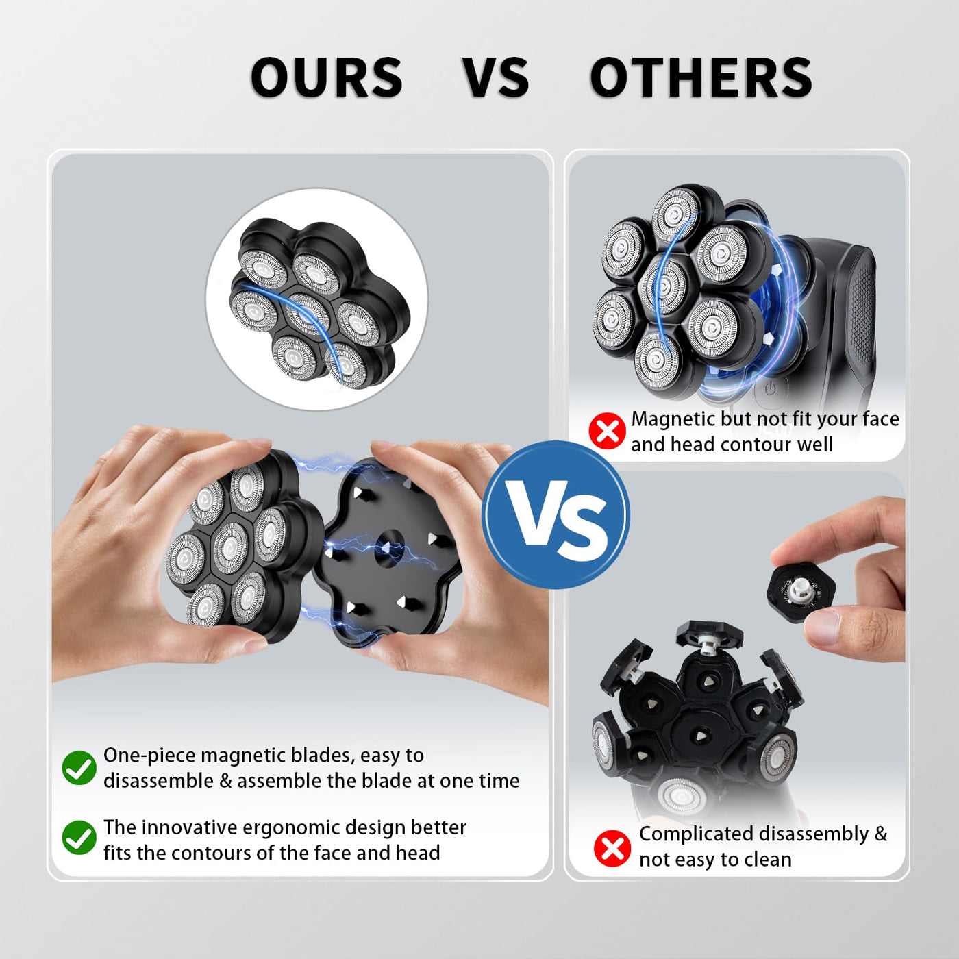 - [Convenience & Large Hair Storage]:One detachable entire magnetic interface blade, the innovative design of bald head shavers for men easy to disassemble and clean, large storage of hair. Quick mount the replacement head on your reusing shavers. Thanks to the design of shavers for men, enjoy fasting & convenient shaving experience! For maximum shaving performance, it is recommended to replace your shaving unit once every 6 months.