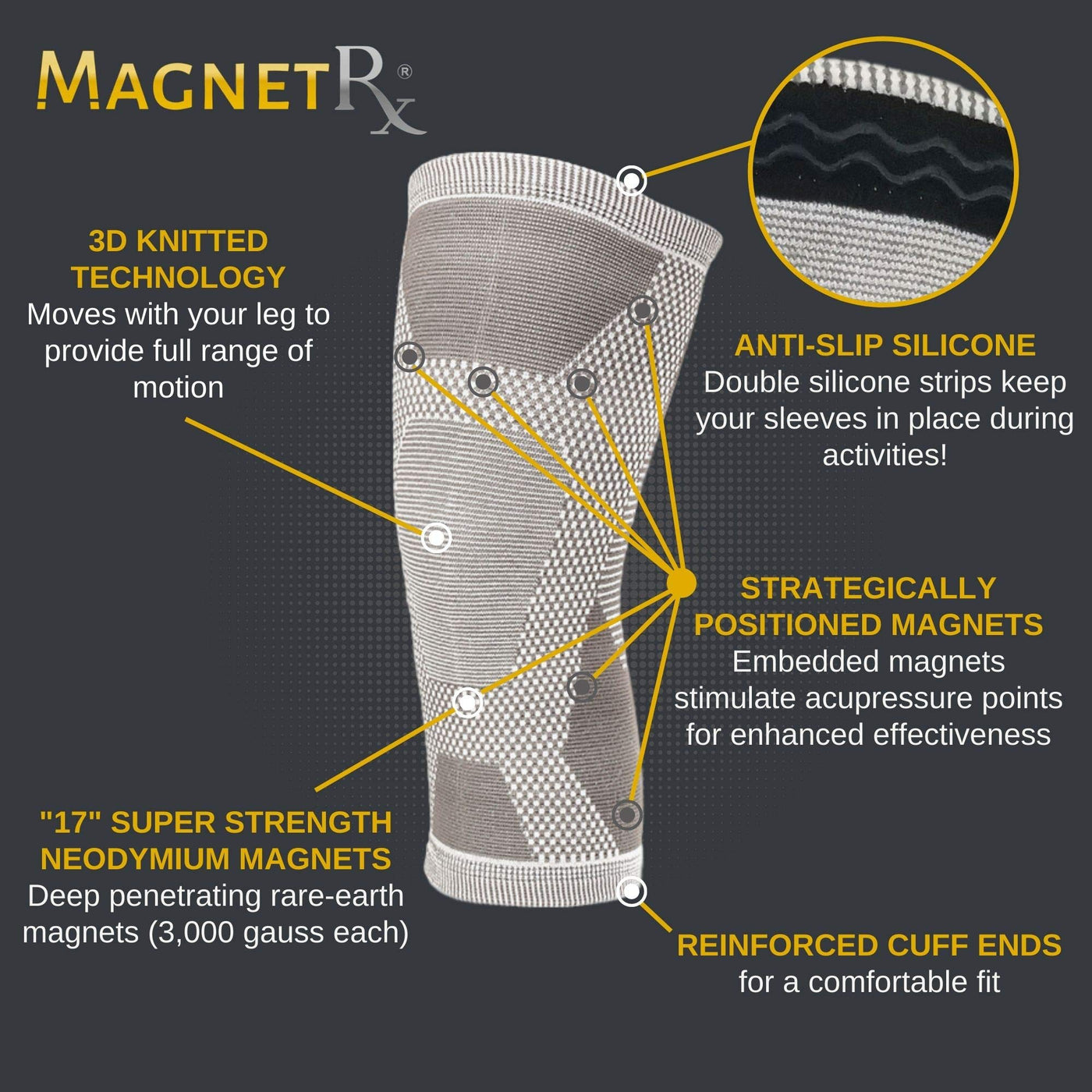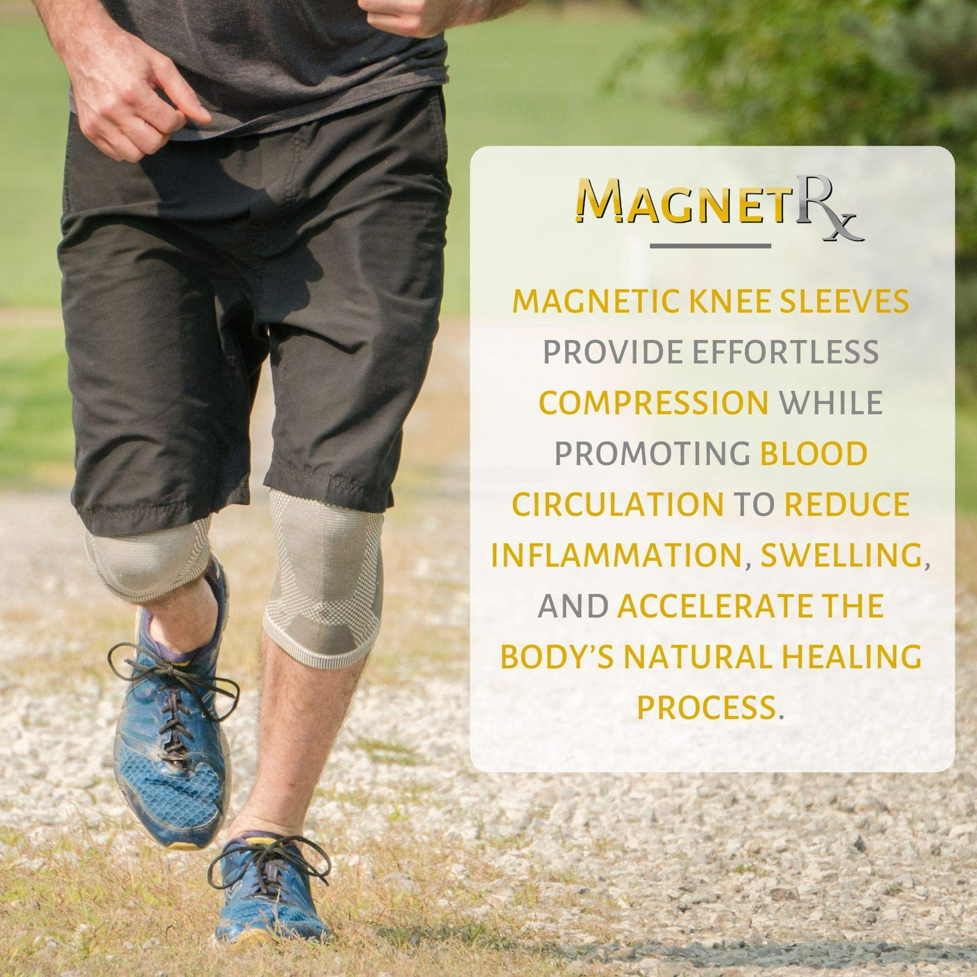 - SUPERIOR MAGNETIC THERAPY: Each MagnetRX magnetic compression knee sleeve has 17 powerful neodymium magnets (3,000 gauss each). These super magnets are bio-north (-) facing and strategically positioned in acupressure points surrounding the knee for maximum relief. Magnet therapy is an effective alternative medicine used for centuries to promote pain relief, reduce inflammation, improve circulation, and balance positive energy!