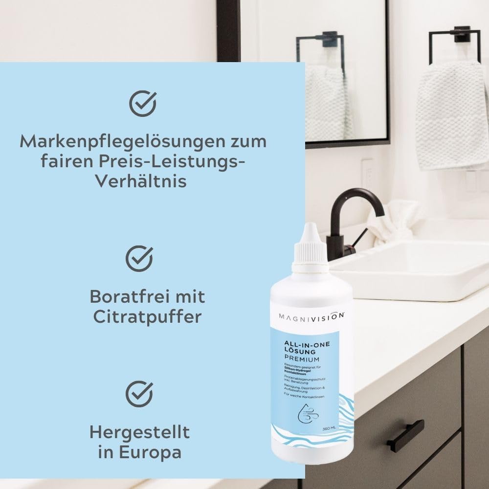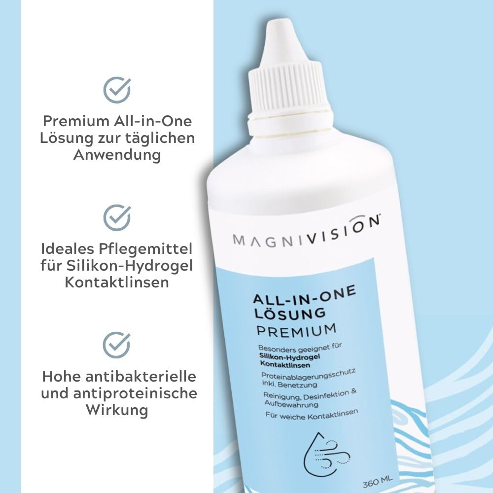 MAGNIVISION All-in-One Solution Premium, 360ml All-in-One solution for soft contact lenses, for cleaning and storing soft contact lenses, borate-free, Made in Europe