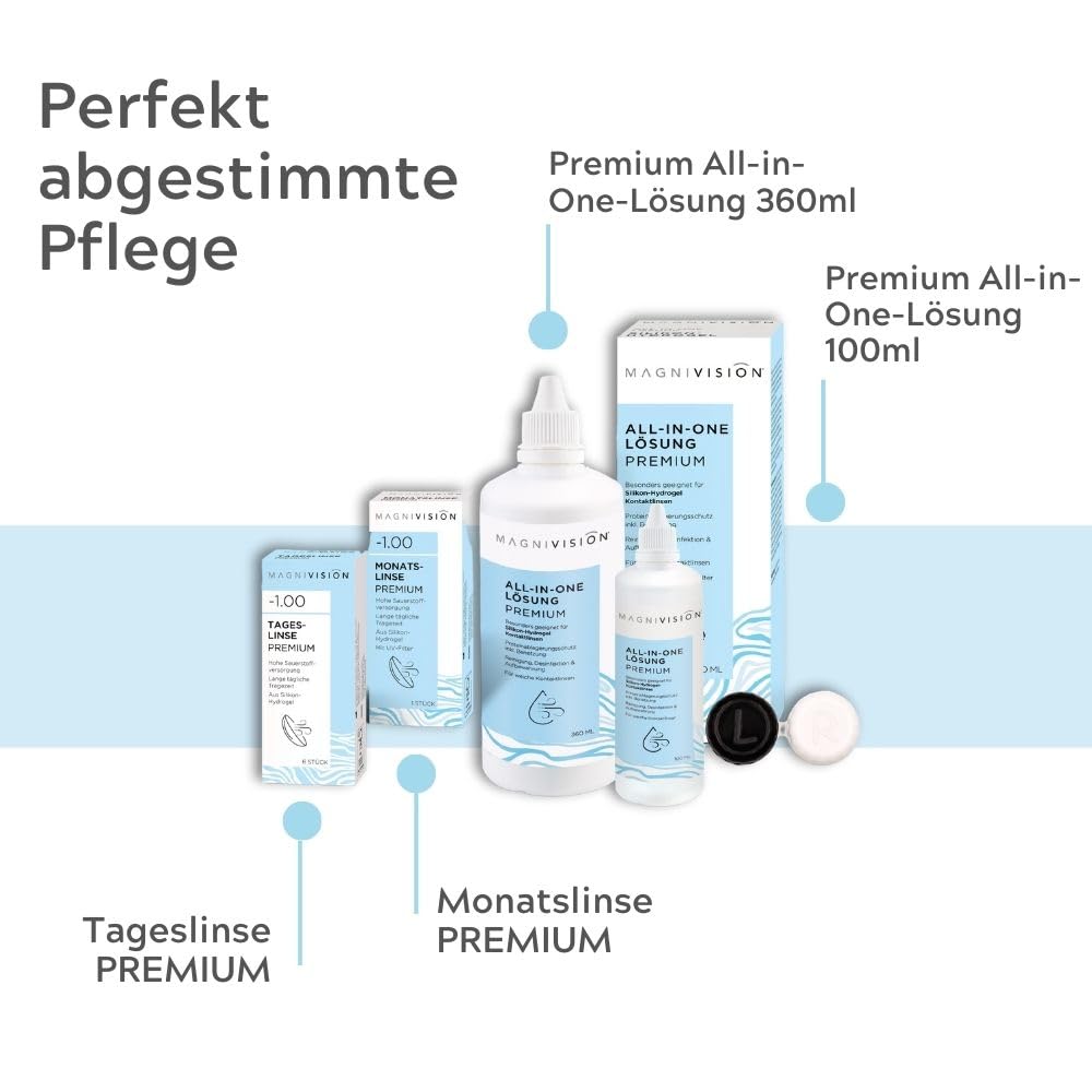 Product description The MAGNIVISION all-in-one solution with 360ml content is the perfect solution for soft contact lenses and is borate free in Europe manufactured. The care product is suitable for all types of soft and Suitable for colored contact lenses and takes care of all the care steps Contact lens routine with just one solution. From cleaning and rinsing You need disinfection and wetting through to storage with the Premium all-in-one solution just one care product. Be conscious of the recipe Avoided borate and instead worked with a citrate buffer Borat is suspected of being potentially harmful to health. Citrate is a natural component of our tears and can therefore can be safely added to the recipe. All MAGNIVISION Brand care solutions become a fair price-performance ratio offered and represent the ideal complement to contact lens care. General information Soft contact lens care P.when('A').execute(function(A) { A.on('a:expander:toggle_description:toggle:collapse', function(data) { window.scroll(0, data.expander.$expander[0].offsetTop-100); }); }); Ingredients / Ingredients Ethylene diamine tetra acetic acid 0.01%, Poly Hexa Methylene Biguanide 0.0002%, Hydroxyethylcellulose 0.0525%, Poloxamer 407 0.235%, Polyquaternium 0.006%, Citric acid, Tribasic sodium citrate, sodium Chloride, Sodium hydroxide anydrus, Purified water. Instructions for use Washing Wash your hands thoroughly. Remove the contact lenses, take a few drops of the MAGNIVISION All-in-One Solution Premium and massage on the back of your hand for a few seconds. Rinse those Remove contact lenses with MAGNIVISION All-in-One Solution Premium and leave them at least 4 hours or overnight in the solution. Before you do that If you insert contact lenses, you will need to reapply them with MAGNIVISION All-in- One solution premium rinse. Close the bottle after use. Warnings Use within 90 days after opening. Between 5°C and 30°C store. Do not use if seal is broken. Repeat Repeat the cleaning process according to the instructions for use after the Contact lenses have been left in the same solution for more than 7 days. Do not use in case of hypersensitivity or allergies to a component. Should that The product is perceived as unpleasant or causes persistent irritation, then stop using it and contact a specialist. Keep away from children. Do not use after the expiry date. Never use tap water to rinse contact lenses. Not swallow. Before any use of ophthalmic medicines consult a specialist while wearing contact lenses. The Do not change your contact lens care system without consulting an ophthalmologist consult. More