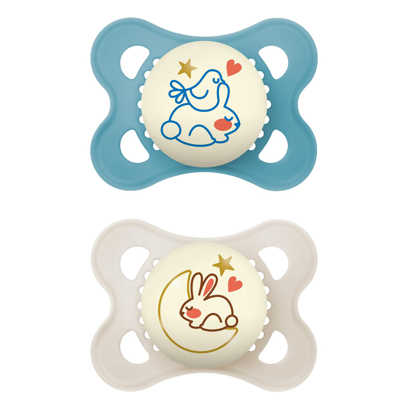 No more frustration trying to find your lost pacifiers at night! The buttons on these baby boy night pacifiers glow in the dark, making them easy to find at night. BPA/BPS-free MAM Night Pacifiers were developed by leading pediatric dentists and developmental psychologists to provide maximum comfort and style for babies age 0-6 months. Our orthodontic pacifiers for breastfed babies combine technological innovation and trendsetting design to help give babies a healthy start in life. The built-in air channel, naturally flattens and extends when sucked, mimicking a human nipple during breastfeeding. The symmetrical nipple fits perfectly in baby’s mouth at any angle and life-like, SkinSoft textured silicone that feels just like mom. With multiple pacifier shapes and nipple sizes to pick from, MAM nipples are easily accepted by babies of all ages, with 94% nipple acceptance among babies tested. Keep your baby's pacifier clean by putting them in the microwave and storing them using the convenient MAM self-sterilizing storage case. Silicone pacifiers kept in the closed box will remain clean for up to 48 hours: Fill pacifier case with water. Place pacifier in the pacifier sterilizing case with the nipple facing down. Follow Pacifier package instructions for microwave setting. Cool completely before use. Developed in conjunction with the International Children’s Medical Research Society. Market research 2010-2020, tested with 1,572 babies