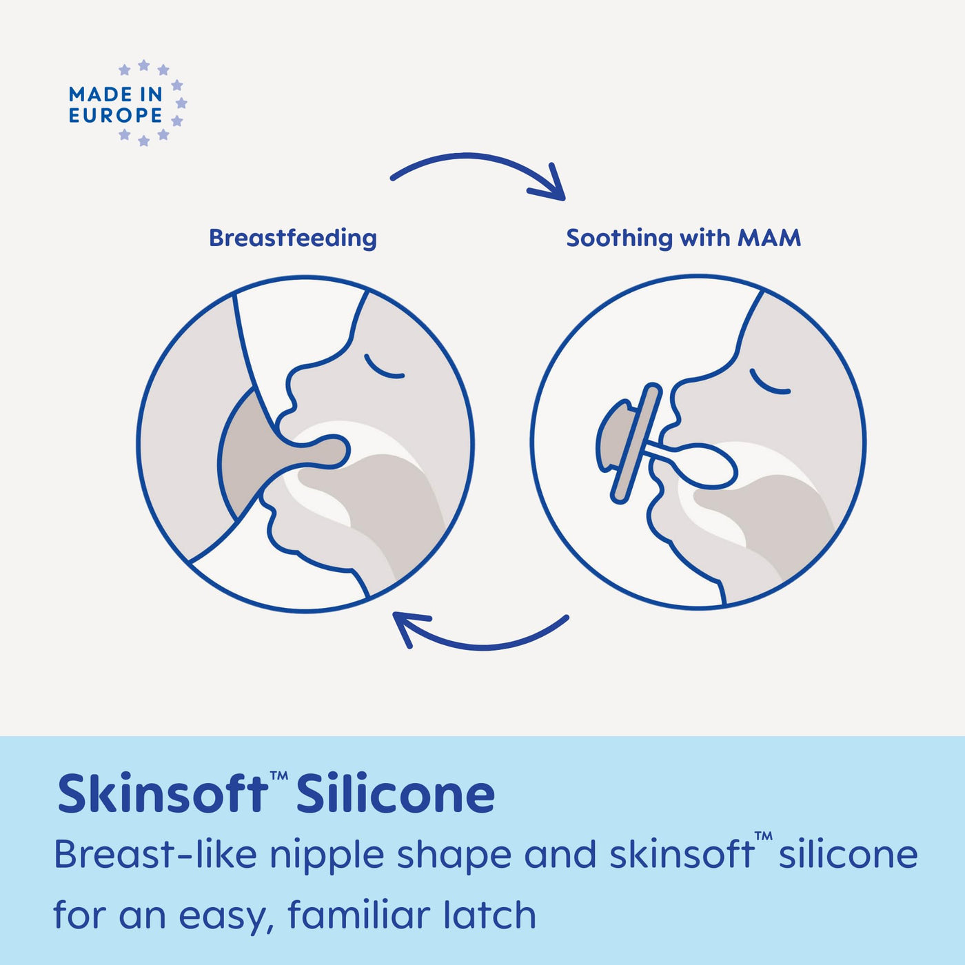 • SILICONE NIPPLE - The BPA-free silicone nipple is a signature MAM pacifier design, with silky SkinSoft material and a symmetrical shape that's ideal for jaw and teeth development.