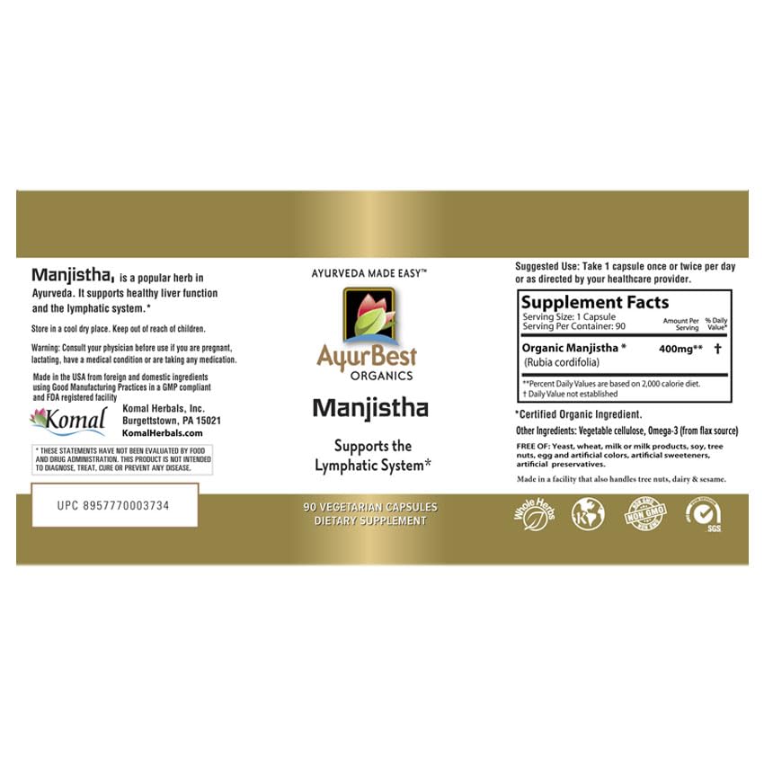 Manjistha Herbal Supplements 400mg Capsules, USDA Organic, Kosher - 90 Count