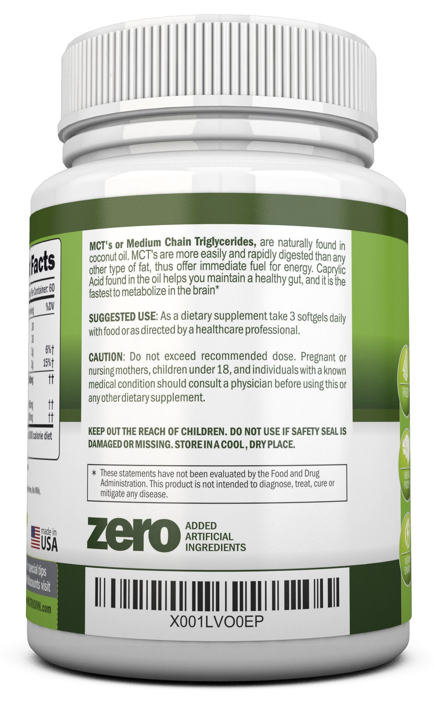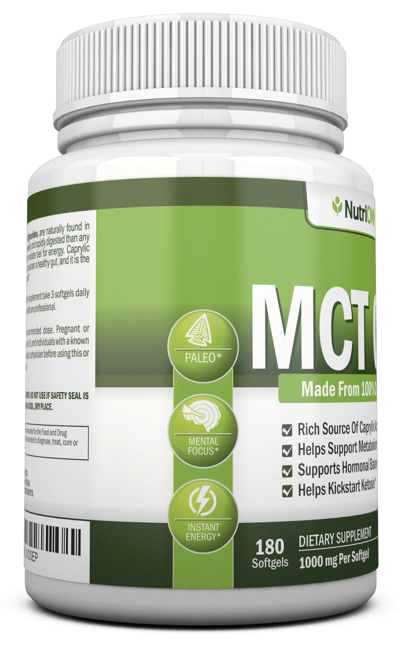 What is MCT Oil? MCTs, or Medium Chain Triglycerides, are naturally found in coconut oil. They are absorbed more easily than other nutrients, providing quick support to the body. Caprylic Acid (C8) in the oil aids in maintaining overall gut health. What is MCT Oil used for? MCT fatty acids are rapidly absorbed by the body, serving as a prompt source of nourishment. Benefits of NutriONN MCT Oil - High quality MCT oil that is easily absorbed by the body. - Provides rapid and natural nourishment for your body. - No rainforests destroyed - our oil is made of coconuts. - Supports immune health, as essential nutrients play a vital role in maintaining proper immune function. - Paleo friendly! NutriONN Promise All NutriONN supplements are manufactured right here in the U.S.A in a GMP-compliant facility. Our labs are FDA- inspected. We provide you with the highest quality pure MCT Oil without any artificial ingredients. Complete Satisfaction Promise Click the "Add to Cart" button now and take advantage of our Complete Satisfaction Promise Today!