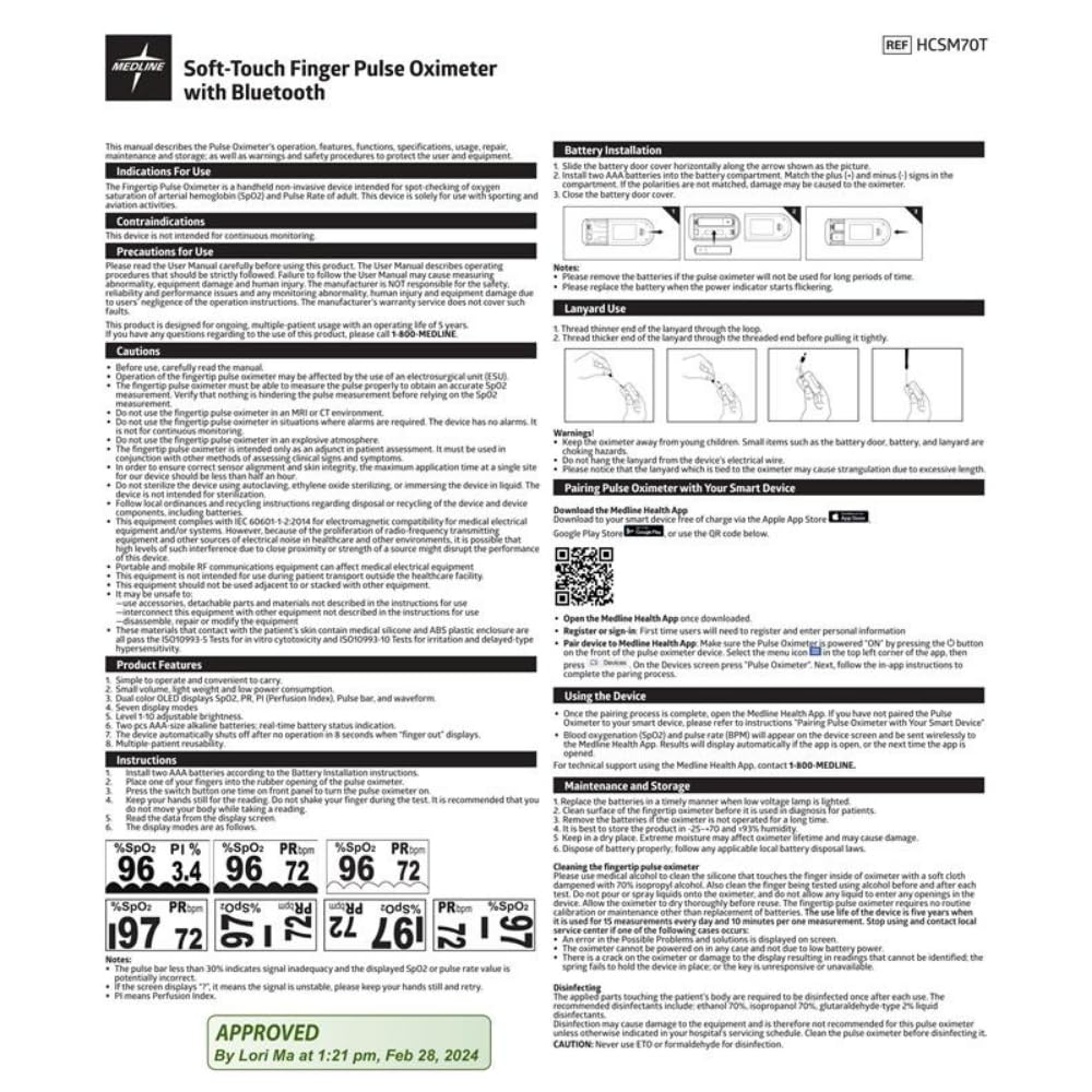Introducing our premium oximeter that offers convenient at-home monitoring through Bluetooth connectivity to the Medline Health App. With this device, you can easily document, track, and share your SpO2 and pulse rate using your phone. It provides accurate readings comparable to healthcare-grade units, and the best part is, no prescription is required for purchase. The small and lightweight finger clip comes with a soft finger pad for added comfort, allowing you to quickly measure your SpO2 and pulse rate. The bright OLED display is easy to read and offers 7 direction viewing modes. This oximeter comes complete with a lanyard, carrying case, instructions, and AAA batteries for your convenience. Manufacturer Contact Information Medline Industries