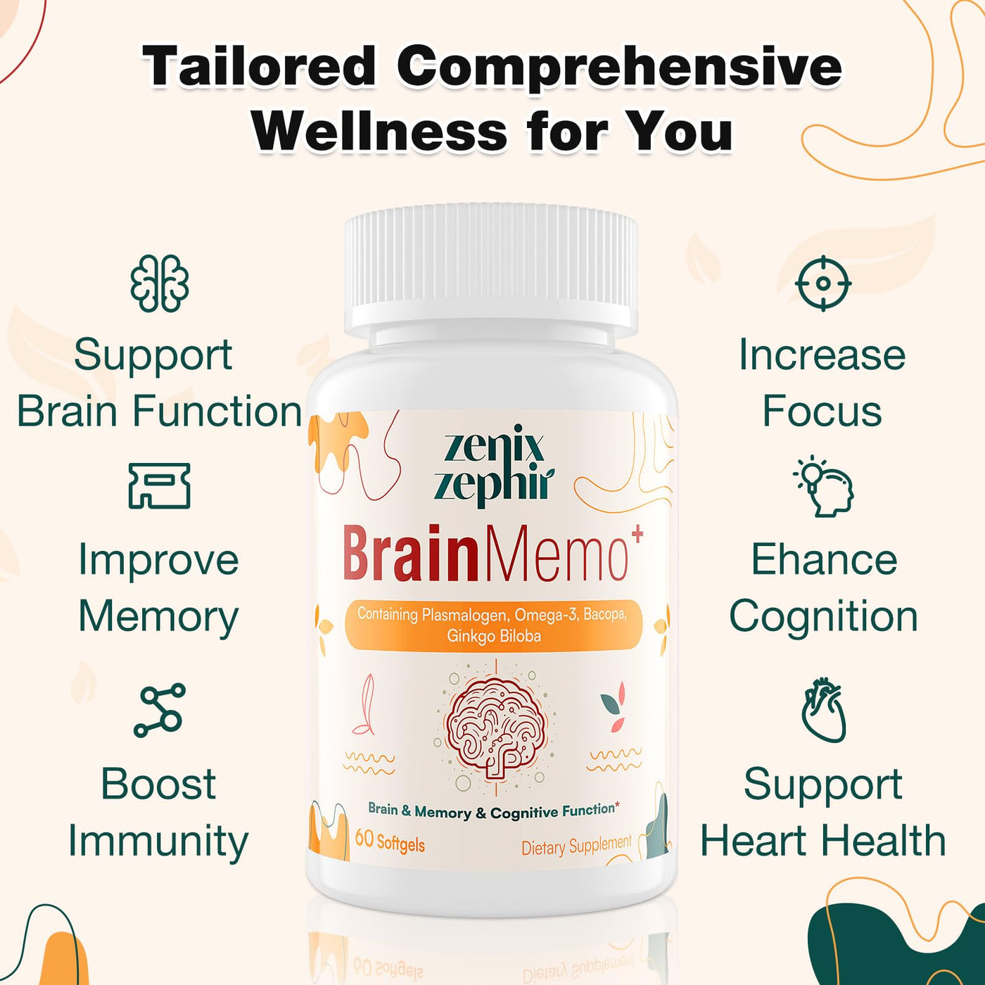 - Cognitive Function & Memory Support: ZenixZephir BrainMemo+ combines Omega-3 fatty acids, Bacopa Monnieri, and Ginkgo Biloba to improve memory, enhance cognitive function
