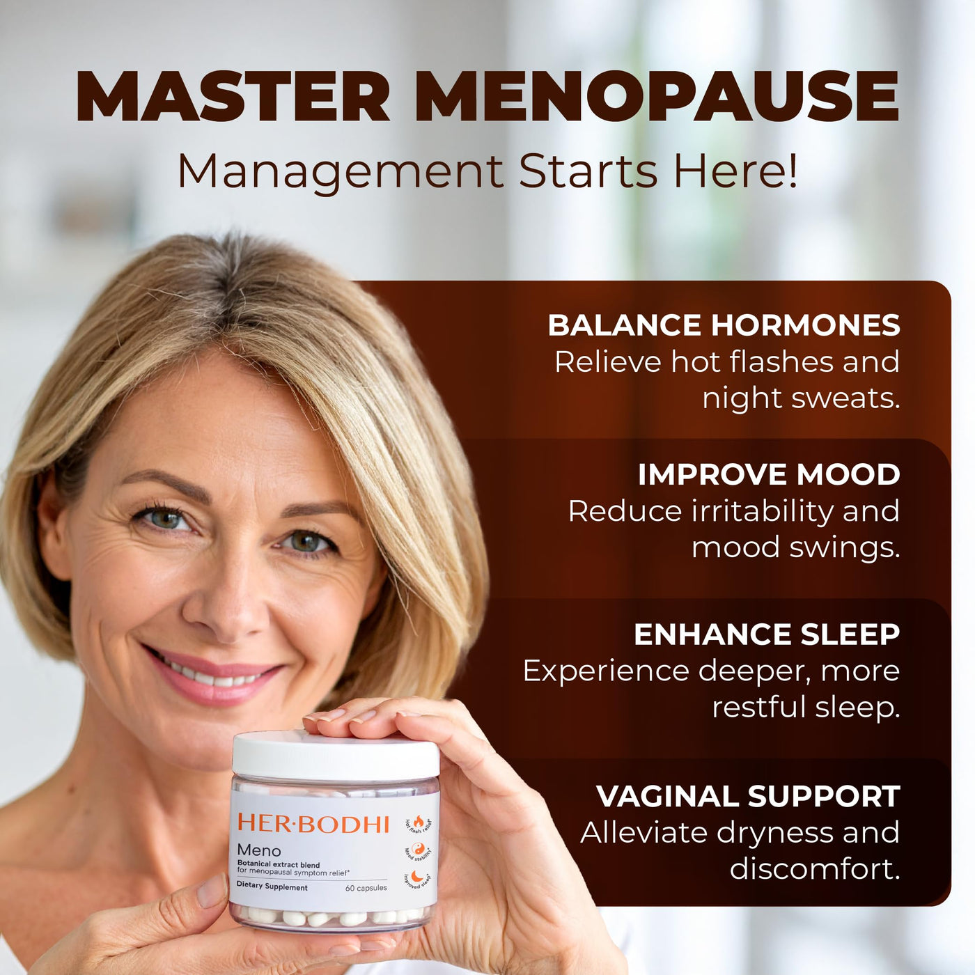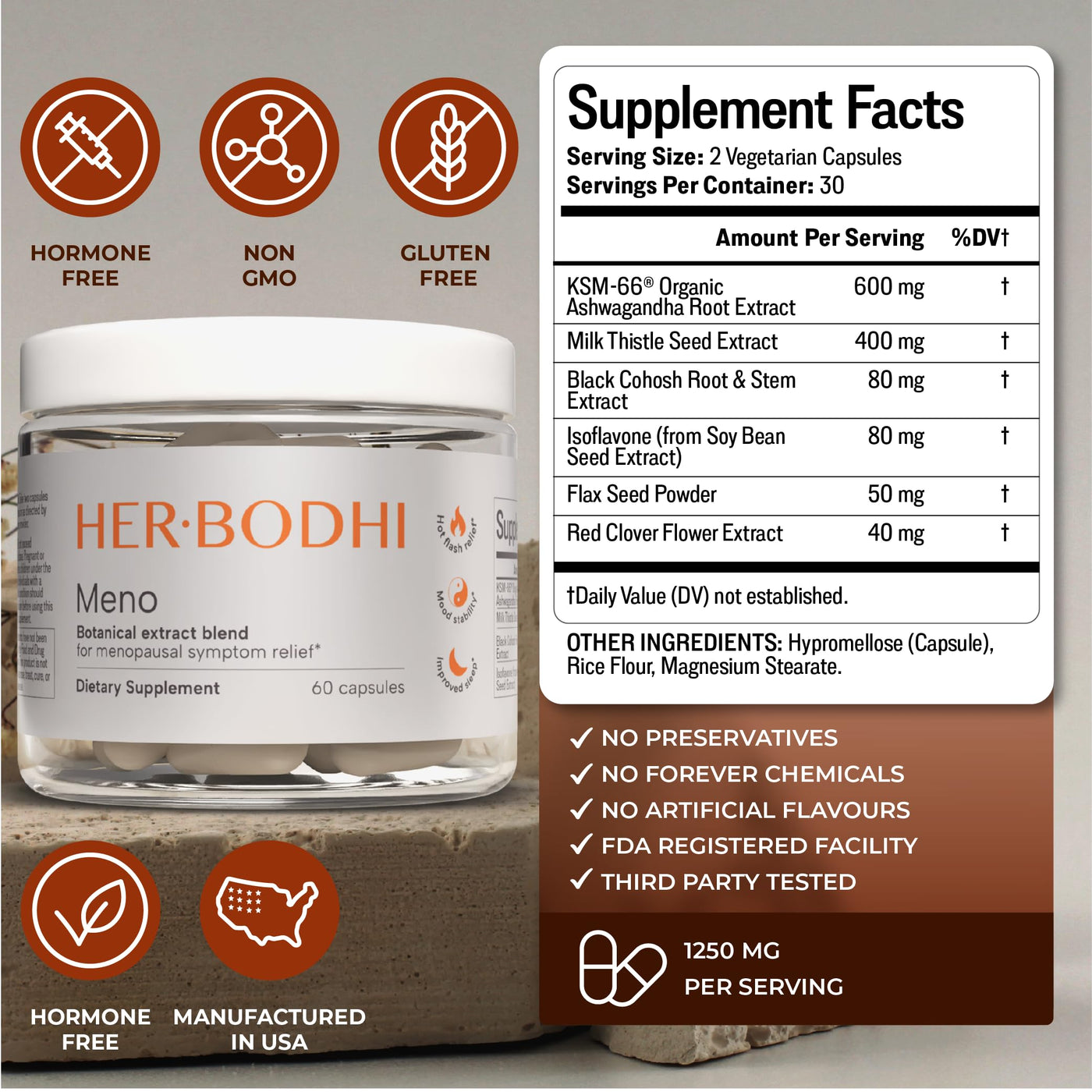 - [Hormone-Free Menopause Relief]: Introducing carefully crafted Her Bodhi MENO menopause supplements for women featuring ingredients to alleviate the symptoms of menopause. Wave goodbye to hot flashes, night sweats, occasional sleep disruptions, mood swings, and the meno belly. Rediscover hormone balance with each bottle containing 60 vegan, sugar-free capsules.