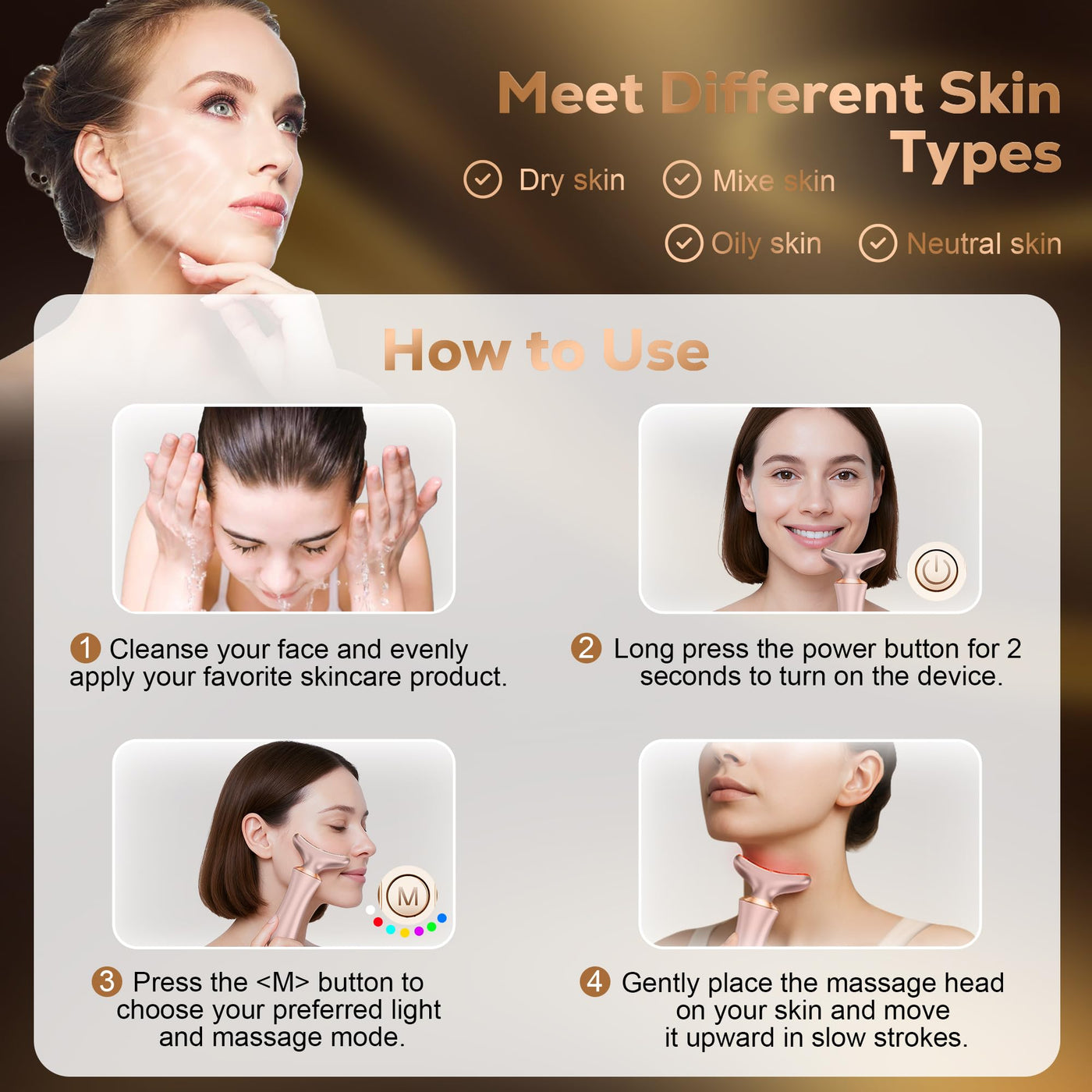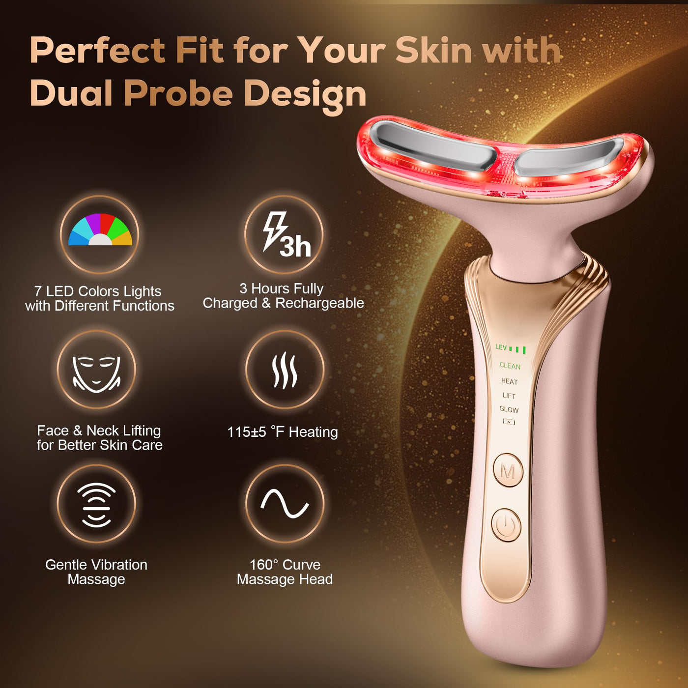 - Customizable Settings with 3 Vibration Levels & 4 Modes: Easily switch between 4 modes (Clean, Heat, Lift, Glow) and 7 LED light colors using intuitive controls. With 3-level adjustable vibration, this face light therapy device suits both beginners and experienced users. Designed with easy-to-use settings for personalized skincare sessions.