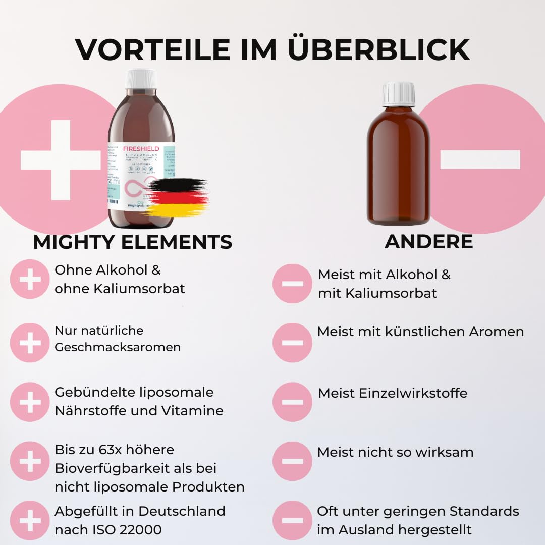 - HIGH-QUALITY PROCESSING: Our Mighty Elements Liposomal Fireshield is vegan, lactose-free and made exclusively from natural raw materials. We have also refrained from adding any sugar or preservatives. Our product is bottled in Germany under the best conditions and subjected to strict quality controls.