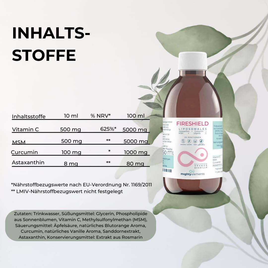 - INGREDIENTS: With Mighty Elements Liposomal Fireshield, at a recommended daily dose of 10 ml, our body actually adds 8 mg of liposomal astaxanthin, 100 mg of liposomal curcumin, 500 mg of liposomal MSM and 500 mg of liposomal vitamin C. Production takes place in Germany and is subject to constant quality controls. The delicious and natural taste of orange and vanilla makes taking it a real pleasure.