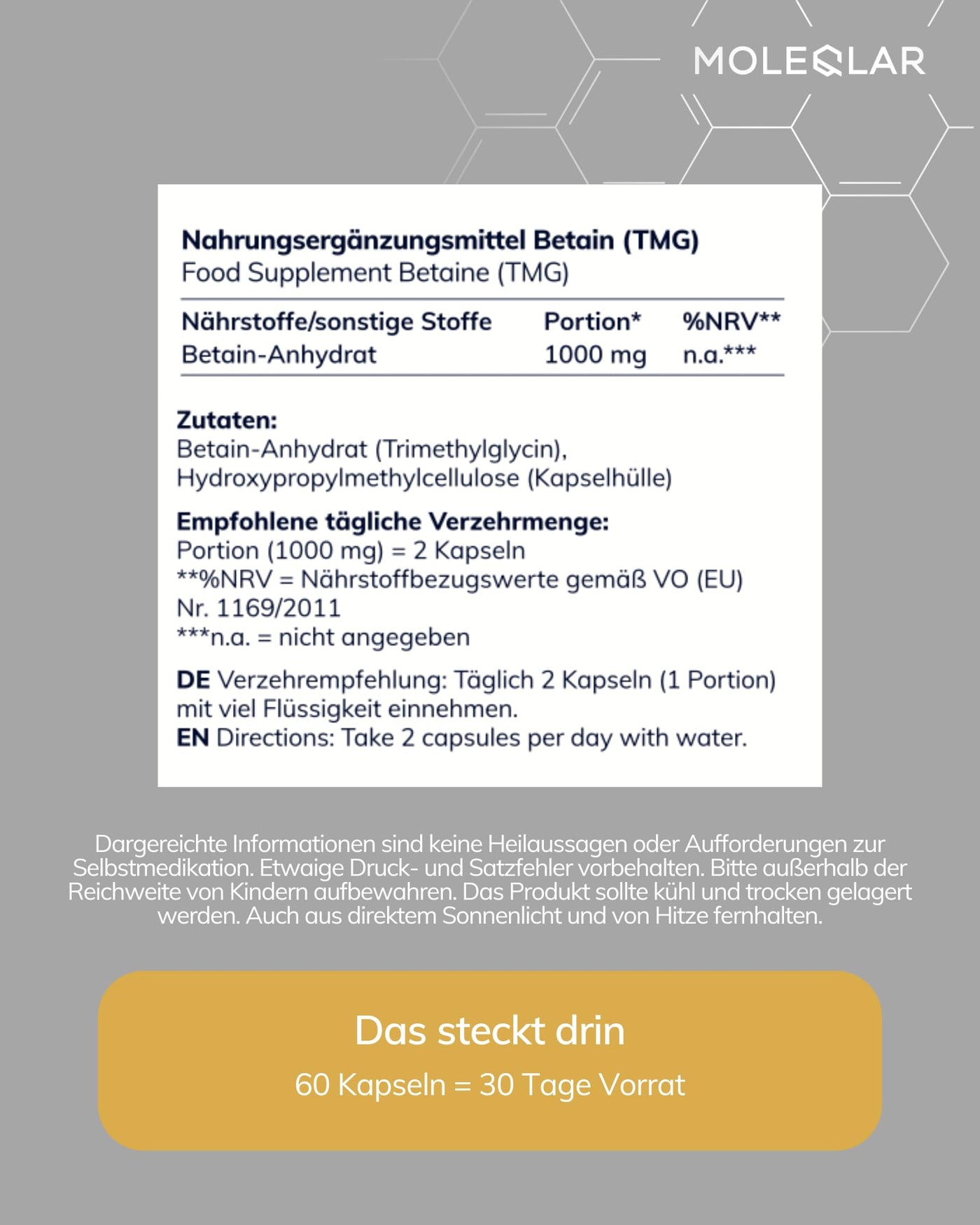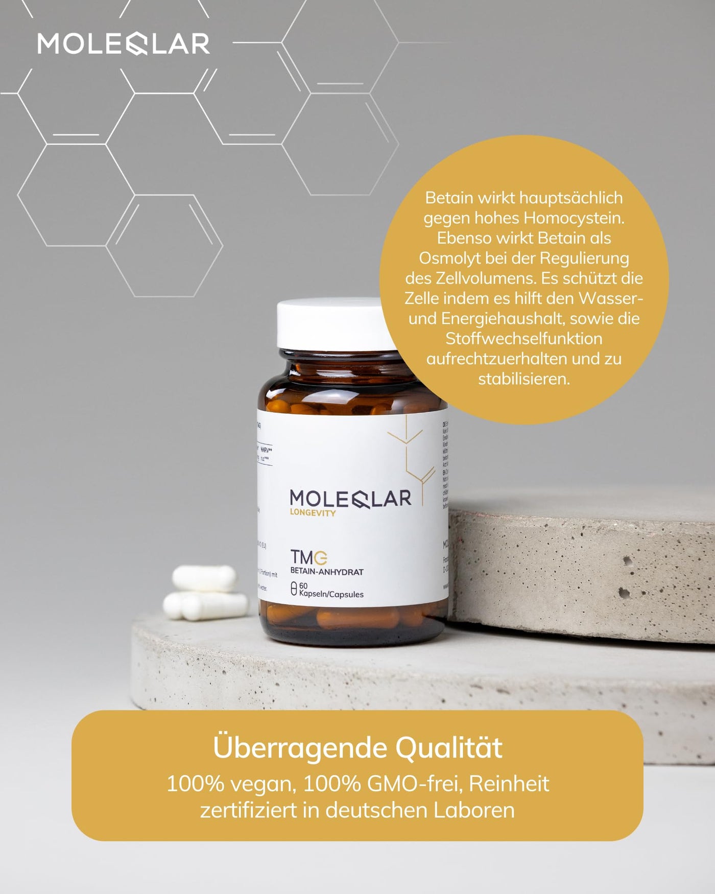 - QUALITATIVELY CONVINCING - We are living longer and longer, but in relative terms we are not living any healthier. In addition to healthy nutrition, MoleQlar betaine capsules (trimethylglycine, TMG) can additionally support and maintain the health of our body. Try it out for yourself now!
