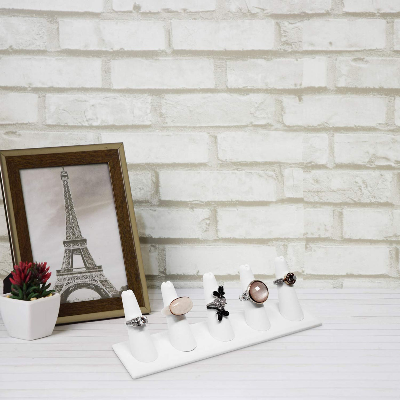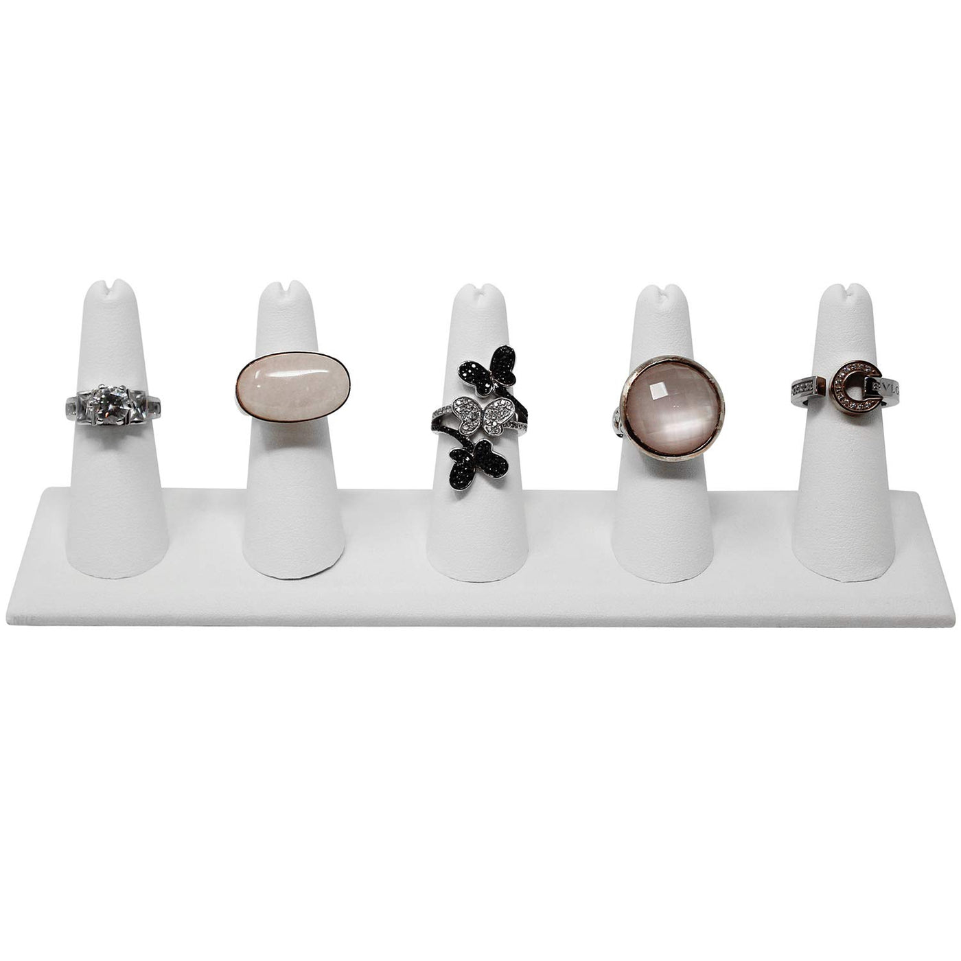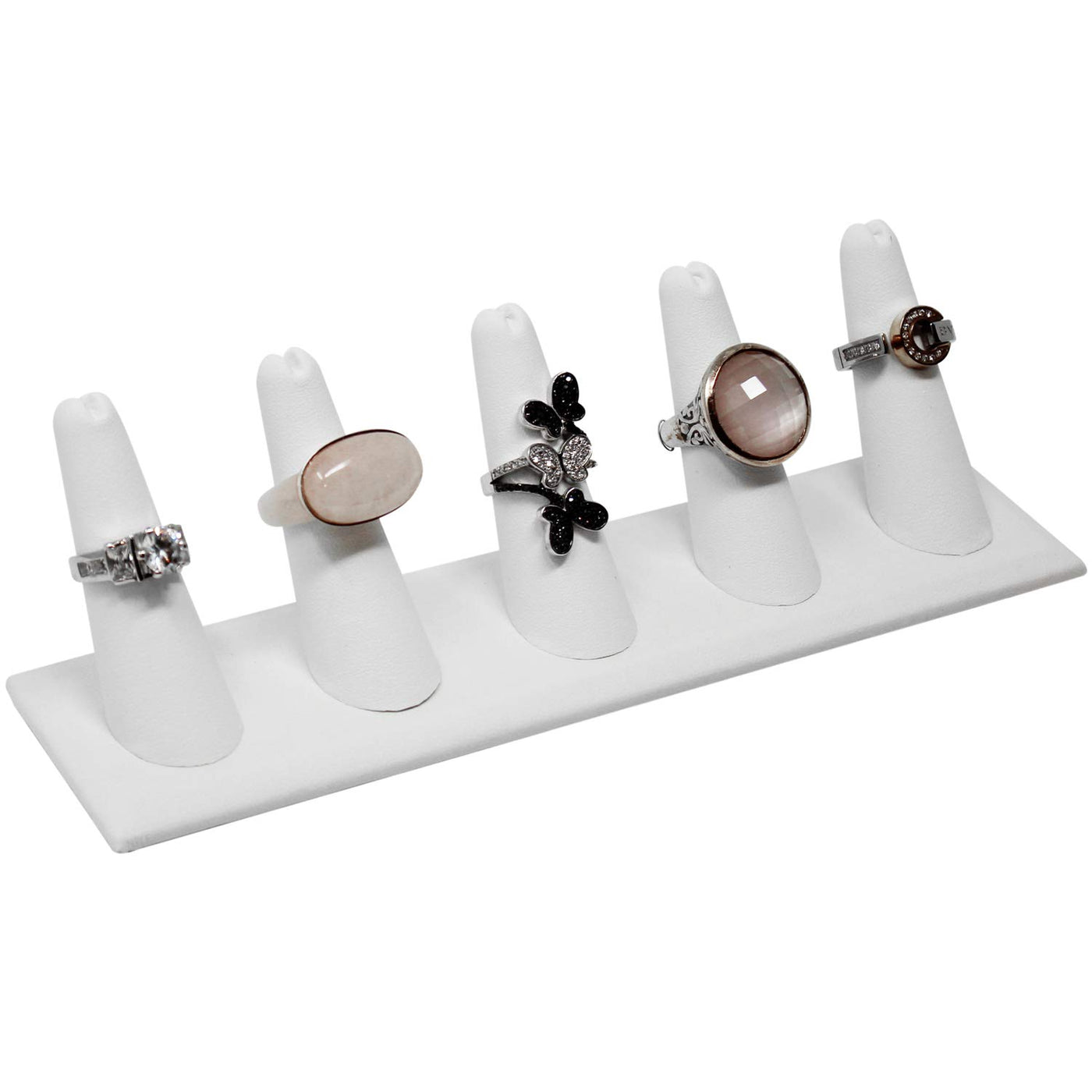 Product Details Displays up to 5 rings on this finger-shaped ring display that is made of wood and covered in white leatherette. Perfect for retail stores, trade shows or personal use, this ring holder can perfectly organize your jewelry collection and professionally showcase them on the countertop. FEATURES Square display base with 5 ring shaped holders. Size Overall: 8"W x 2 1/8"D x 2 1/2"H, each; 2 pieces of ring stands per order.