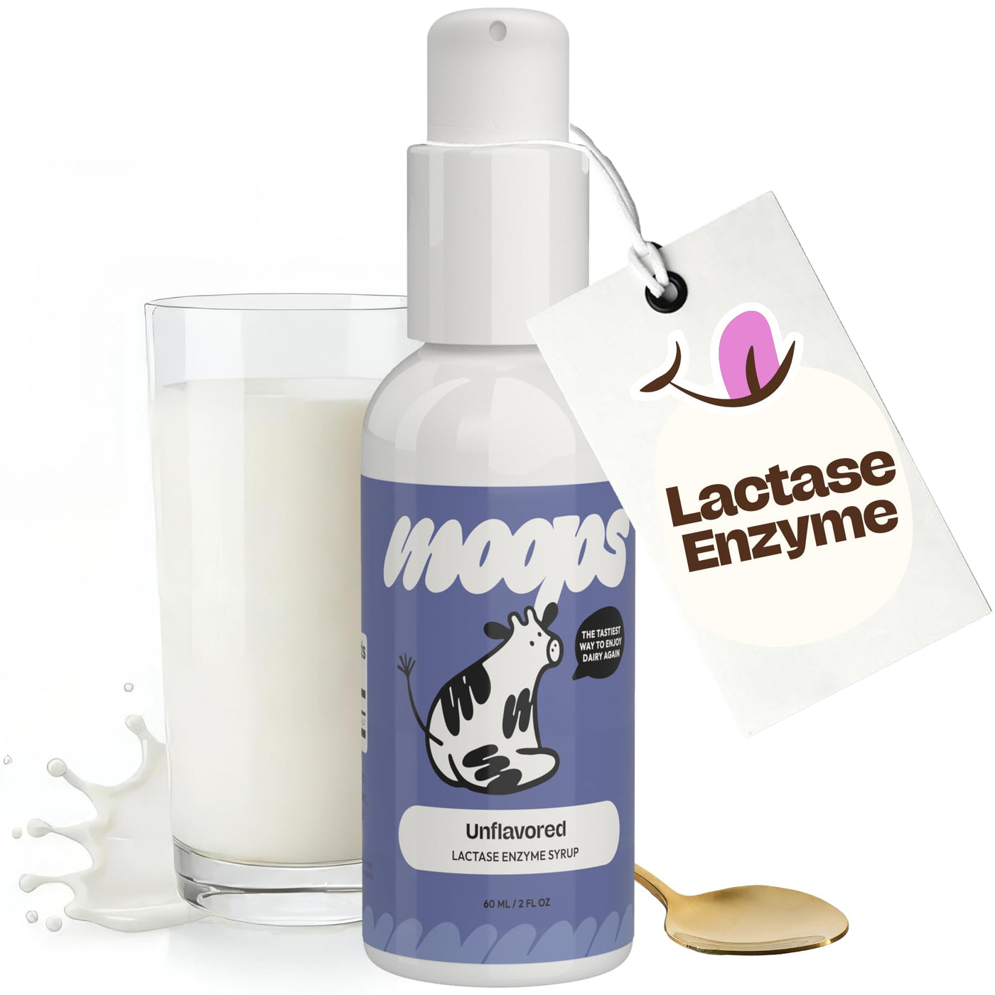 Moops Liquid Lactase Enzyme Syrup 2oz – Pure and Unflavored Flavor – 10,000 FCC Units for Fast Acting Dairy Relief – Customizable Dosing for Lactose Intolerance – Portable Twist-to-Lock Pump