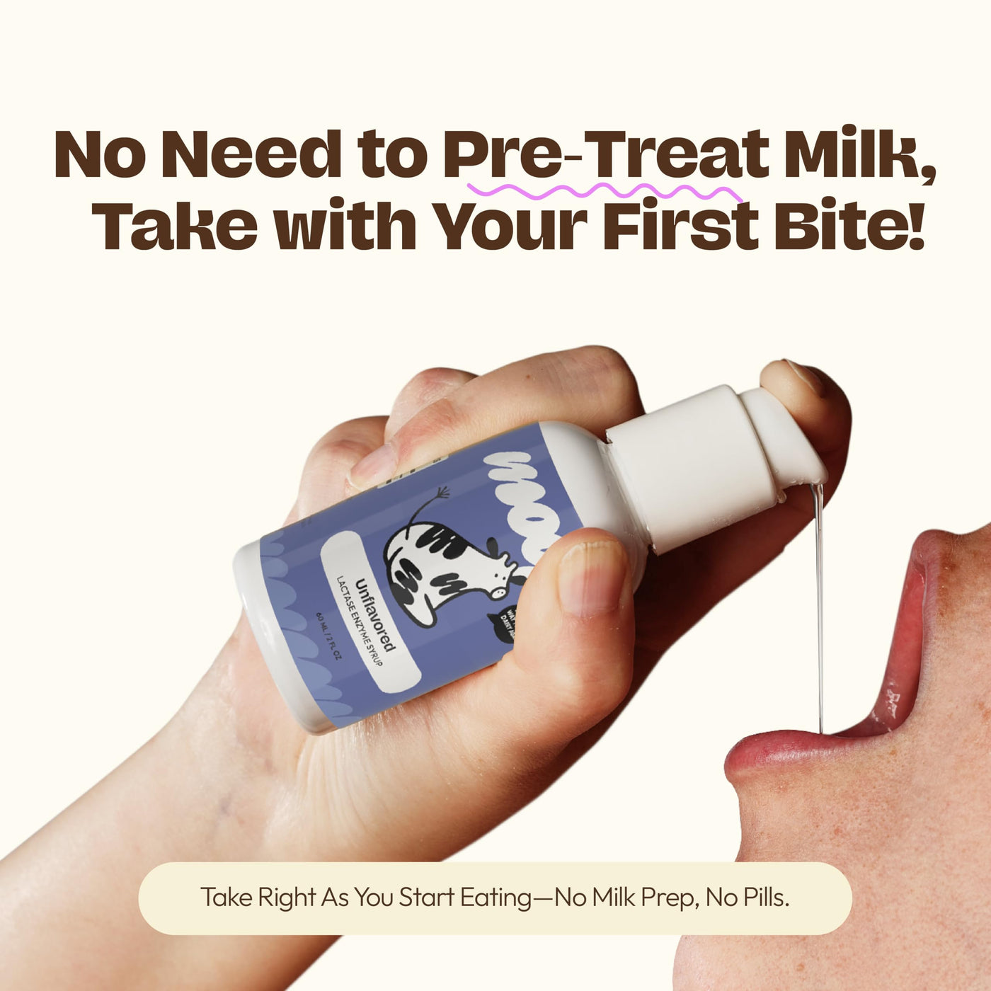 - TWIST-TO-LOCK, LEAK-FREE PUMP FOR ANYWHERE USE Our lactase syrup comes in a portable, twist-to-lock pump thats leak-proof and mess-free. Drizzle on your food, pump directly into your mouth, or take it on a spoon. Moops beats clunky pill bottles, offering convenience and style for your lactose free life