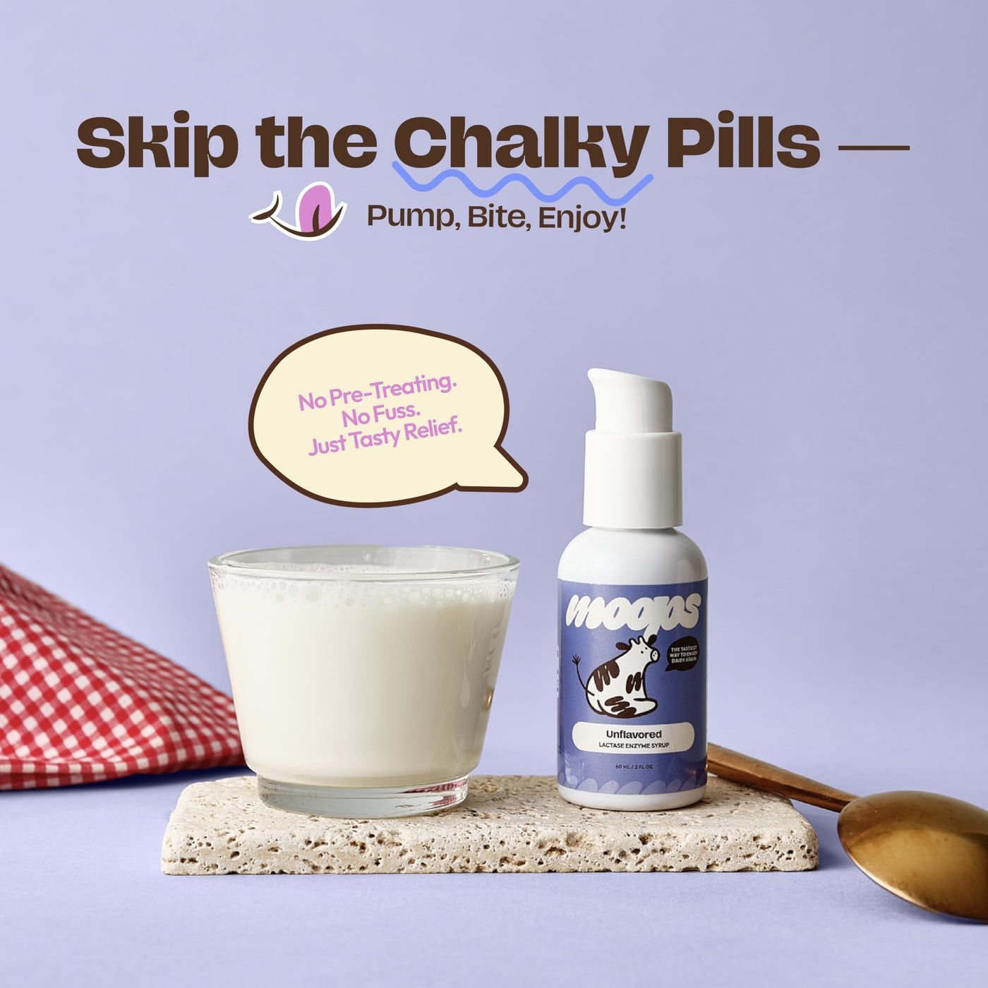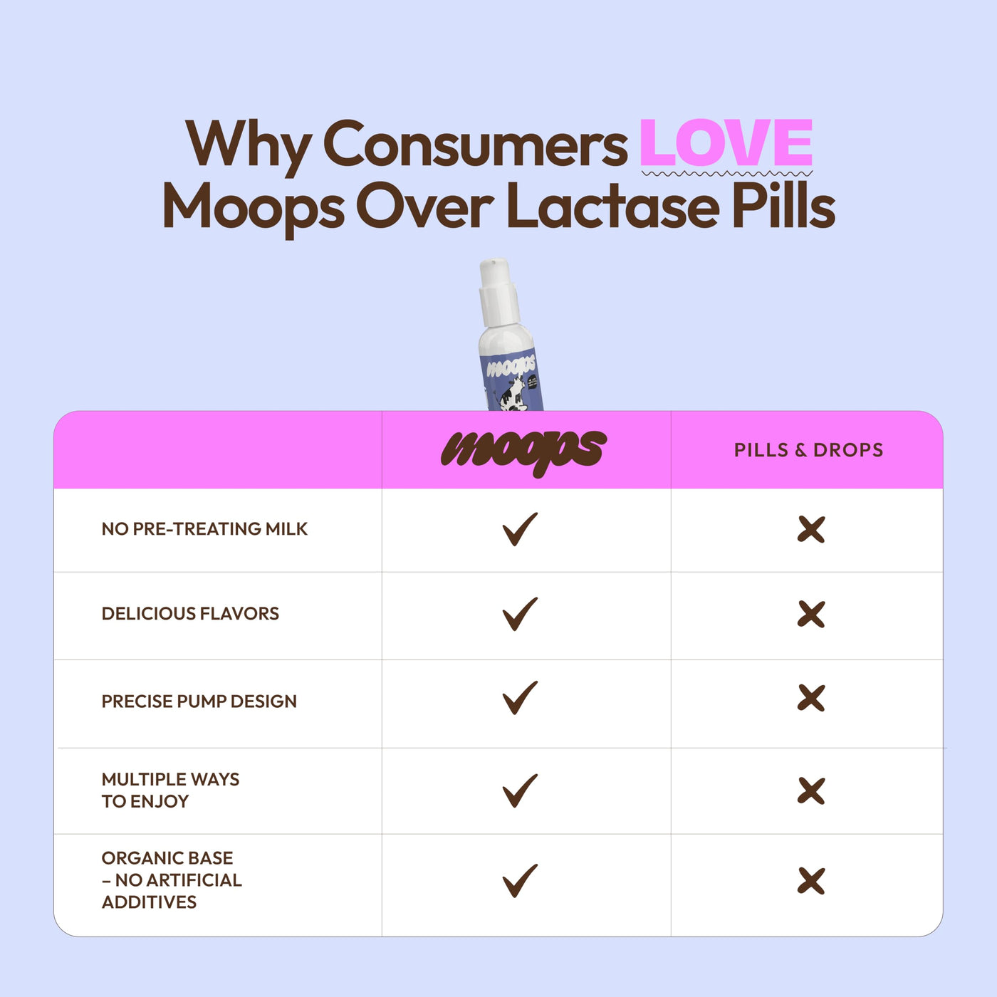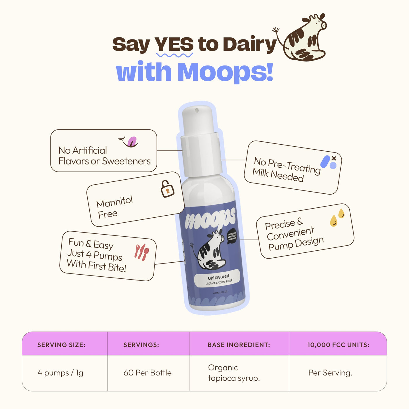 - CUSTOMIZABLE DOSING, BECAUSE DAIRY DAYS VARY Lactose intolerance isnt one-size-fits-all, and neither is Moops. Take 4 pumps per dose or adjust as needed. Whether youre tackling a cheesy pizza or creamy latte, Moops gives you the freedom that lactase pills or dairy relief pills just cant