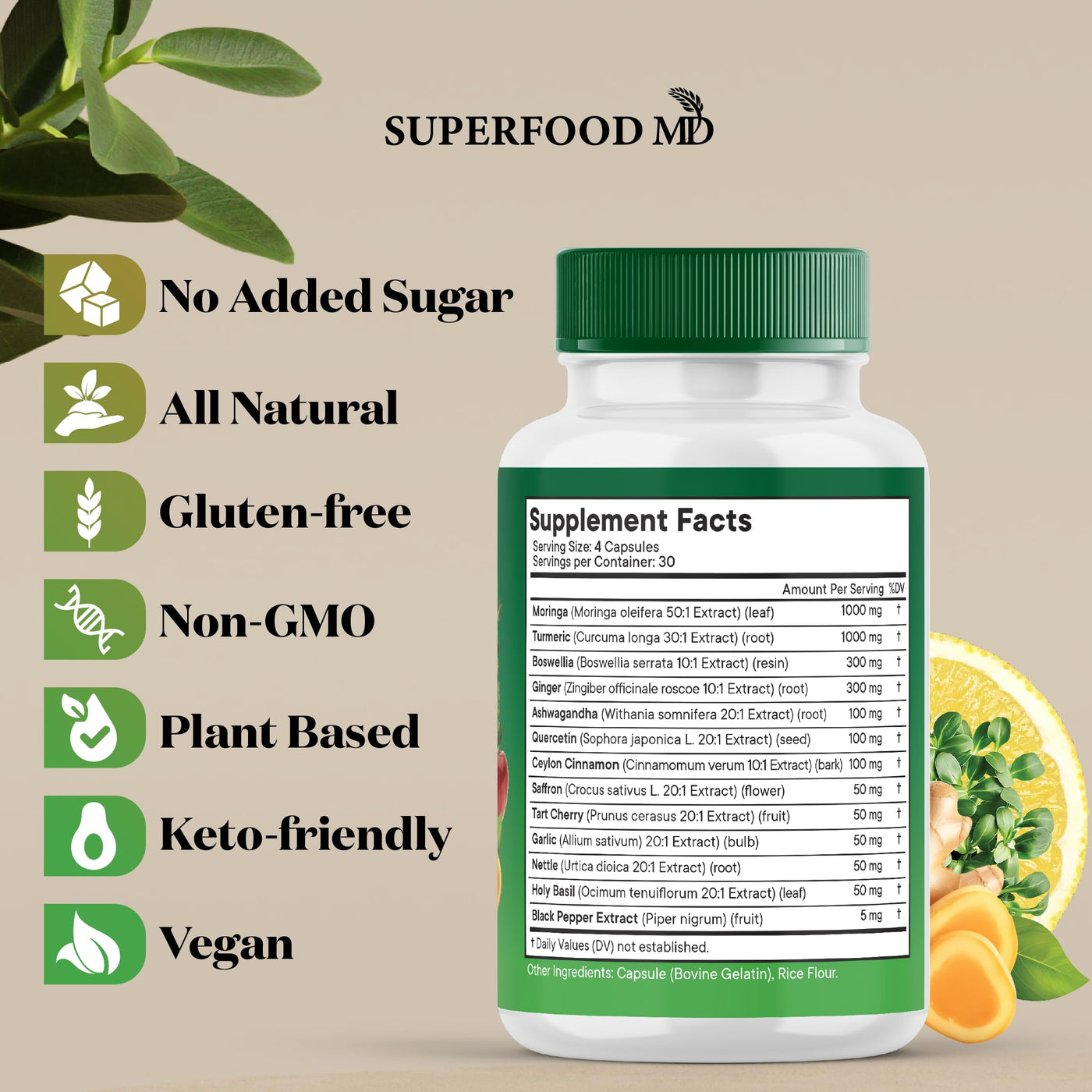 - Advanced Moringa with Turmeric Curcumin, Black Pepper & Ginger Supplements for Both Women and Men Our formula blends Turmeric and Ginger with Moringa Leaf, Boswellia Serrata, and Saffron, delivering outstanding results. While typical joint health supplements may include just Turmeric and Ginger or Moringa capsules, Superfood MD has developed a more powerful all-in-one supplement for enhanced effectiveness.