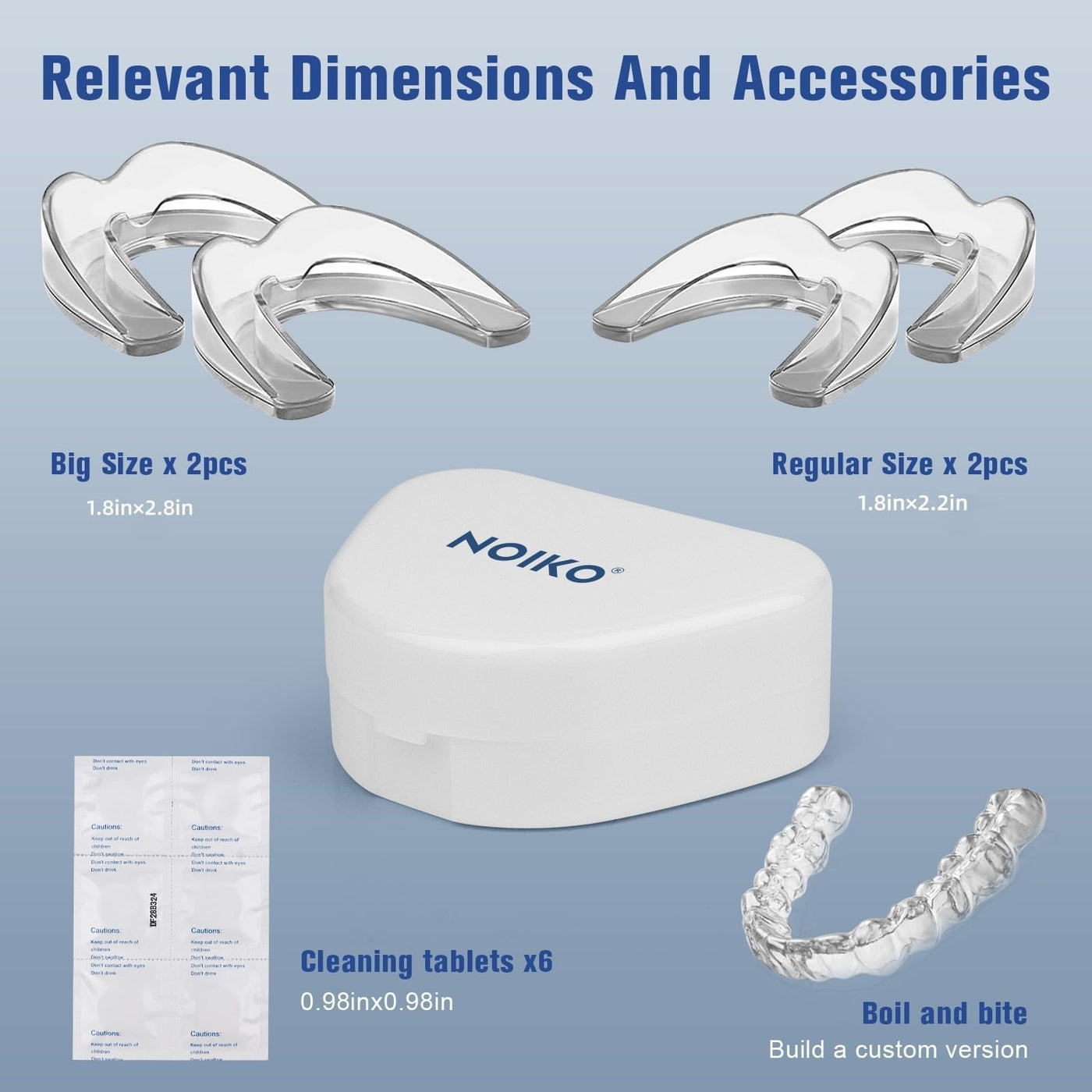 - Suitable for a variety of users: Our mouth guard for sleeping is equipped with 4 mouthguards and 2 different sizes (1.8in*2.2in+1.8in*2.8in), which can meet the needs of most users. The customizable mouthguards can be precisely trimmed to fit each individual's needs, ensuring a unique and comfortable experience for every user