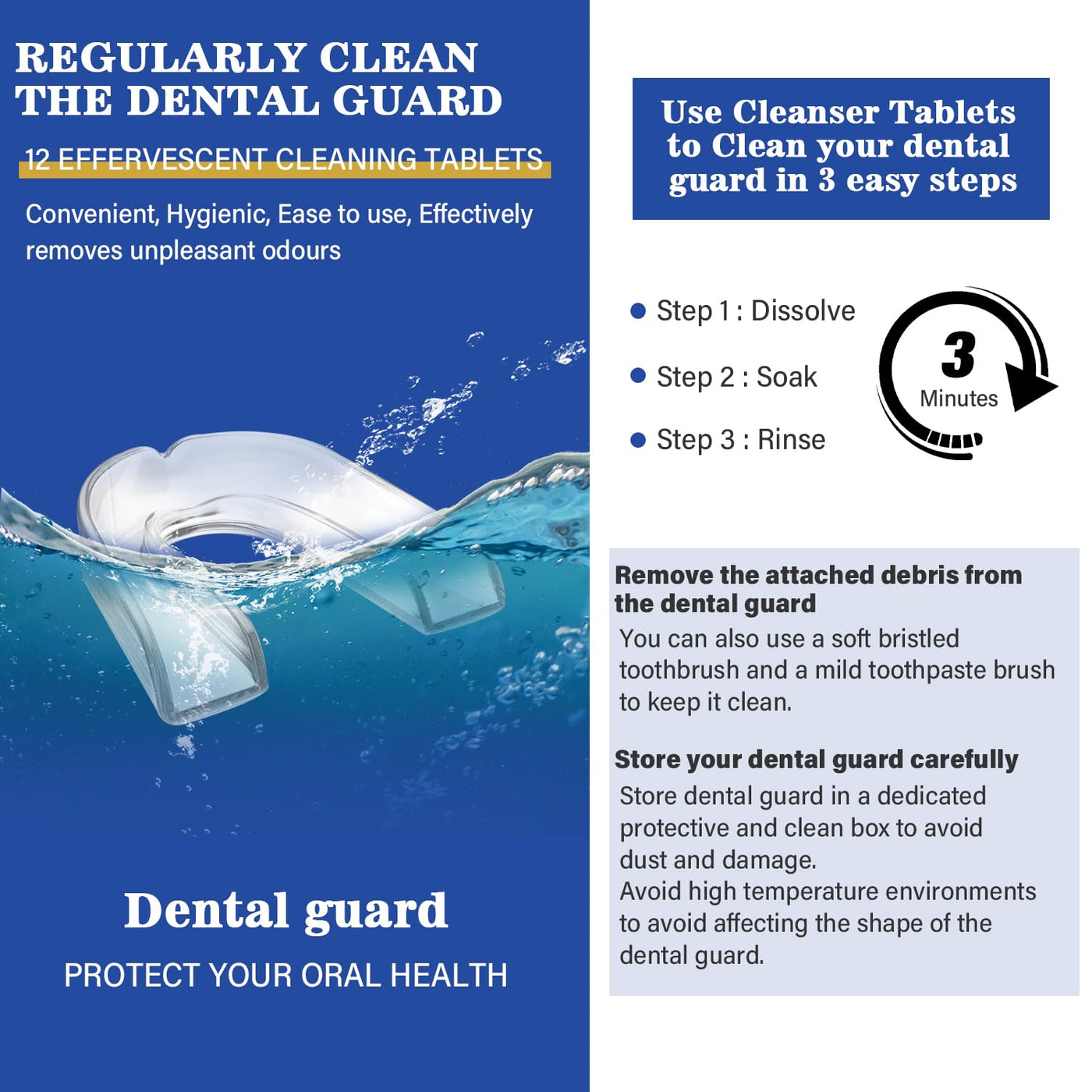- EASY CLEANING WITH TABLET CLEANER Each set includes 12 cleaning tablets for effortless maintenance. Dissolve a tablet in water, soak your mouth guard, and enjoy a fresh, bacteria-free experience after every use.