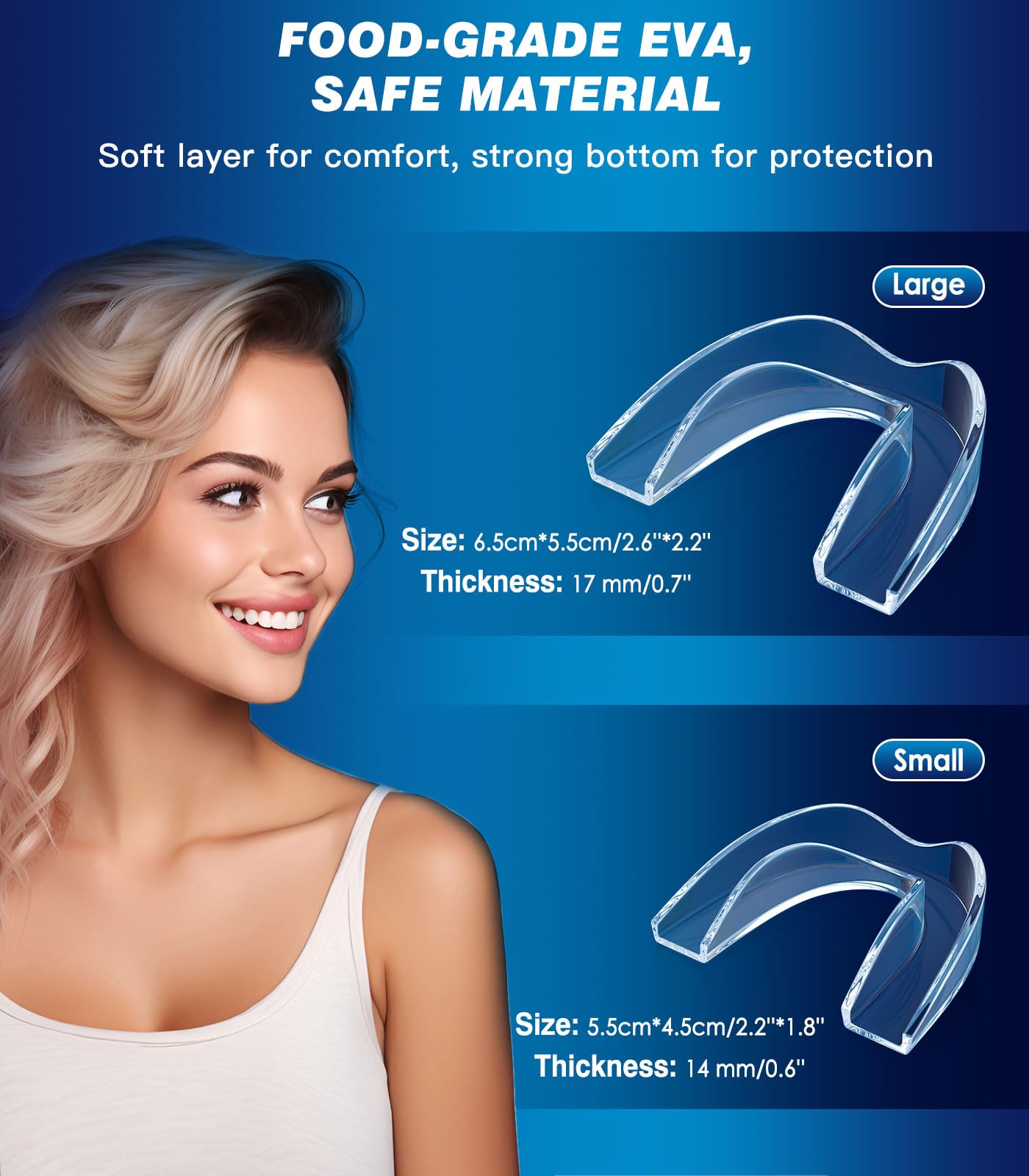 - Easy to Use - The mouthguard is durable and the sides are soft, thin and flexible to ensure a soft feel and secure fit. The sides of the mouthguard are soft and thin, so no matter what the alignment or size of your teeth, Dental mouth guard will fit any mouth size, and can be cut to your own measurements for a more customized and comfortable fit. To use, please follow the steps in the included instructions.