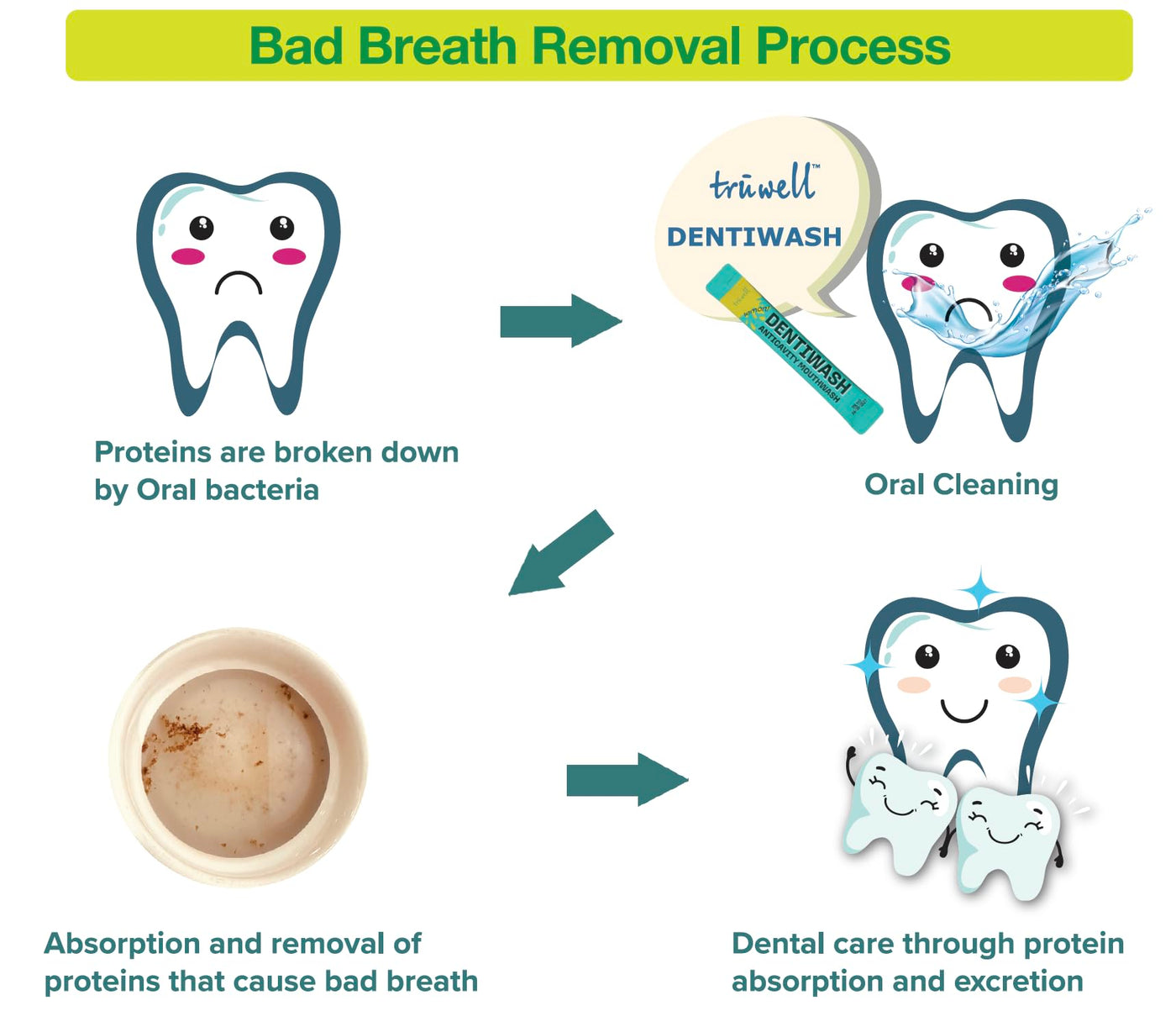 - HEALTHY TEETH - Dentiwash prevents cavity, gingivitis, periodontitis, bad breath, and dry mouth. Dentiwash's special formula absorbs and removes proteins that cause bad breath.