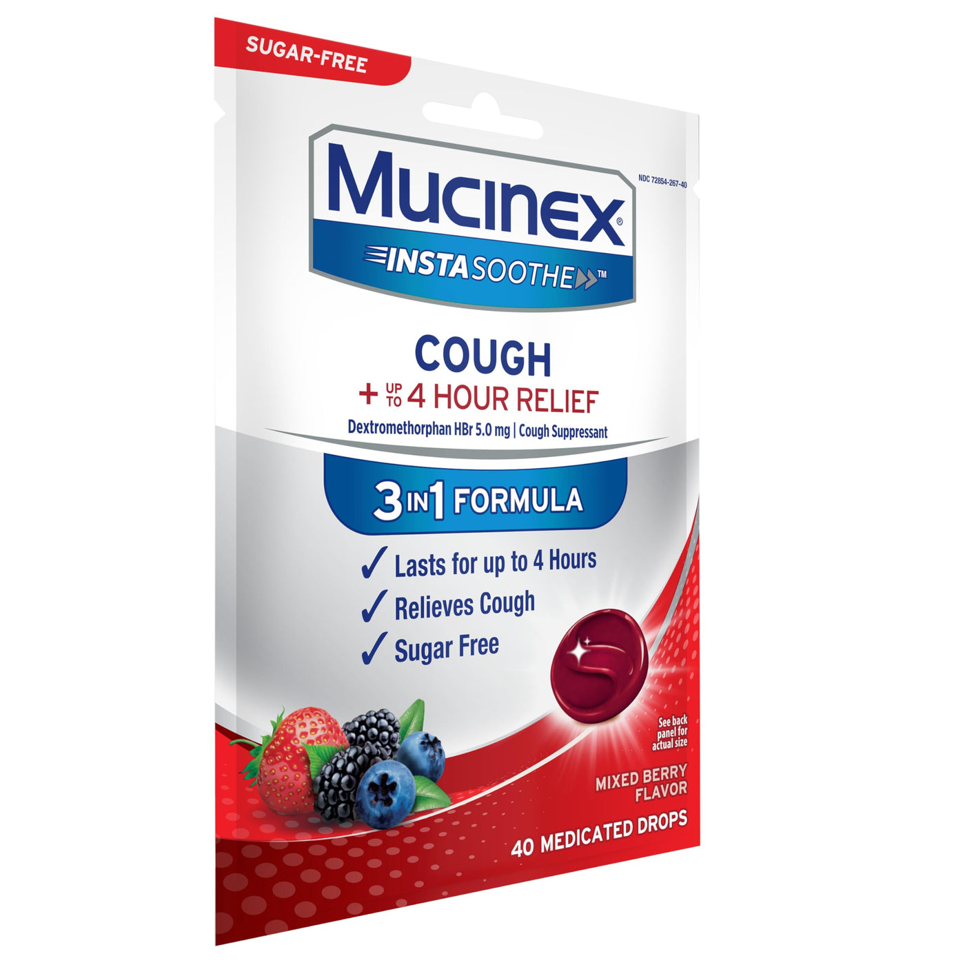 Mucinex Instasoothe Sugar Free Cough Drops contain Dextromethorphan HBr which provides up to 4 hours of cough relief. These mixed berry flavor cough suppressant lozenges provide cough relief that lasts. Our Mucinex cough drops are sugar free and do not contain aspartame. These cough drops for adults & kids 6+ are a perfect on-the-go cough suppressant. Each sugar free cough drop is individually wrapped & sealed, making them easy to toss in your bag or pocket. Adults and children 12 years of age and over: take 2 lozenges (one immediately after the other) and allow each lozenge to dissolve slowly in the mouth; may be repeated every 4 hours as needed, not to exceed 12 lozenges in any 24-hour period. Children 6 to under 12 years of age: take 1 lozenge and allow product to dissolve slowly in the mouth; may be repeated every 2 hours as needed, not to exceed 6 lozenges in any 24-hour period. Children under 6 years of age: do not use. Looking for Mucinex sore throat lozenges? Check out our Mucinex Instasoothe Sore Throat Relief Elderberry & Wild Cherry flavor medicated drops. For sore throat spray, try Mucinex Instasoothe Kickstart Sore Throat Winterfresh Flavor Spray. Look for Mucinex Fast-Max for cough & cold medicine to help get you through cold and flu season.