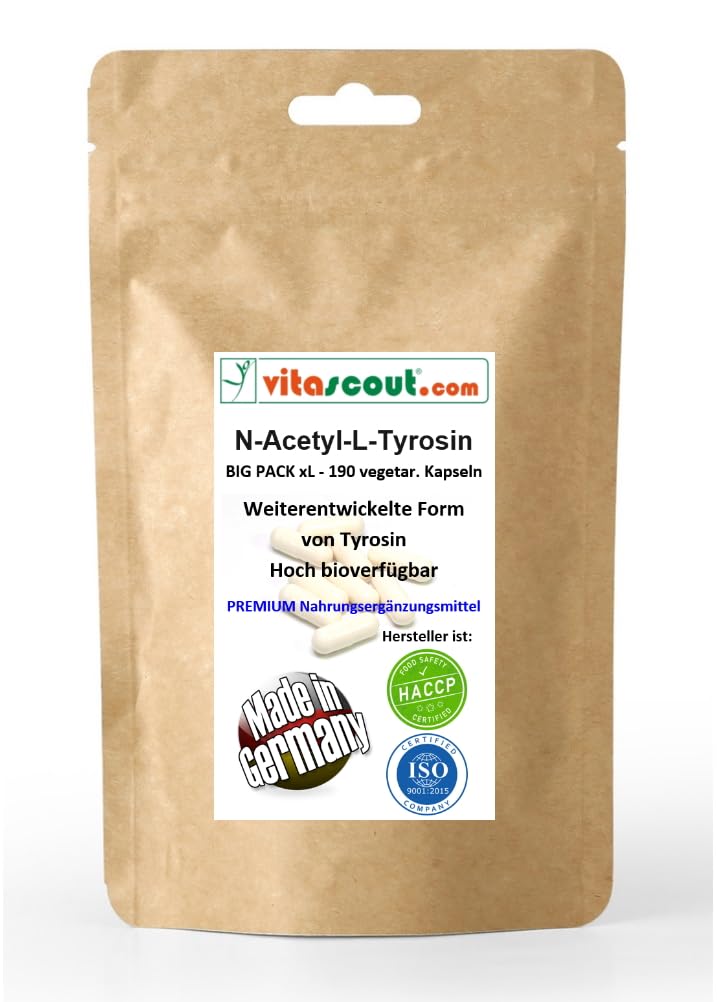 Product description N-Acetyl L-Tyrosine NALT 500mg - 190 vegetarian capsules Please only buy quality MADE IN GERMANY, no cheap goods from Eastern Europe! The further developed tyrosine in Vitascout quality proteinogenic amino acid with excellent bioavailability. IN PHARMA QUALITY - MADE IN GERMANY - HIGH DOSE Ingredients: 500mg N-Acetyl L-Tyrosine - NALT - Another one Ingredient consisting of approx. 96% stearic acid + 4% magnesium capsule vegetarian (Hydroxypropylmethylcellulose) Ingredients / Ingredients 1 capsule contains: 500mg N-Acetyl L-Tyrosine - NALT nutrient reference value for daily Supply according to Appendix 13 of Regulation (EU) 1169/2011 (LMIV) not known Other ingredients: Another ingredient consisting of approx. 96% Stearic acid + 4% magnesium P.when('A').execute(function(A) { A.on('a:expander:toggle_description:toggle:collapse', function(data) { window.scroll(0, data.expander.$expander[0].offsetTop-100); }); }); Instructions for use Recommended intake: 2 capsules a day with plenty Fluid before two of the main meals, or as discussed with your doctor. Address of manufacturer/importer Vitascout B.V, Menist Straat 5c, NL-7091 ZZ Dinxperlo More