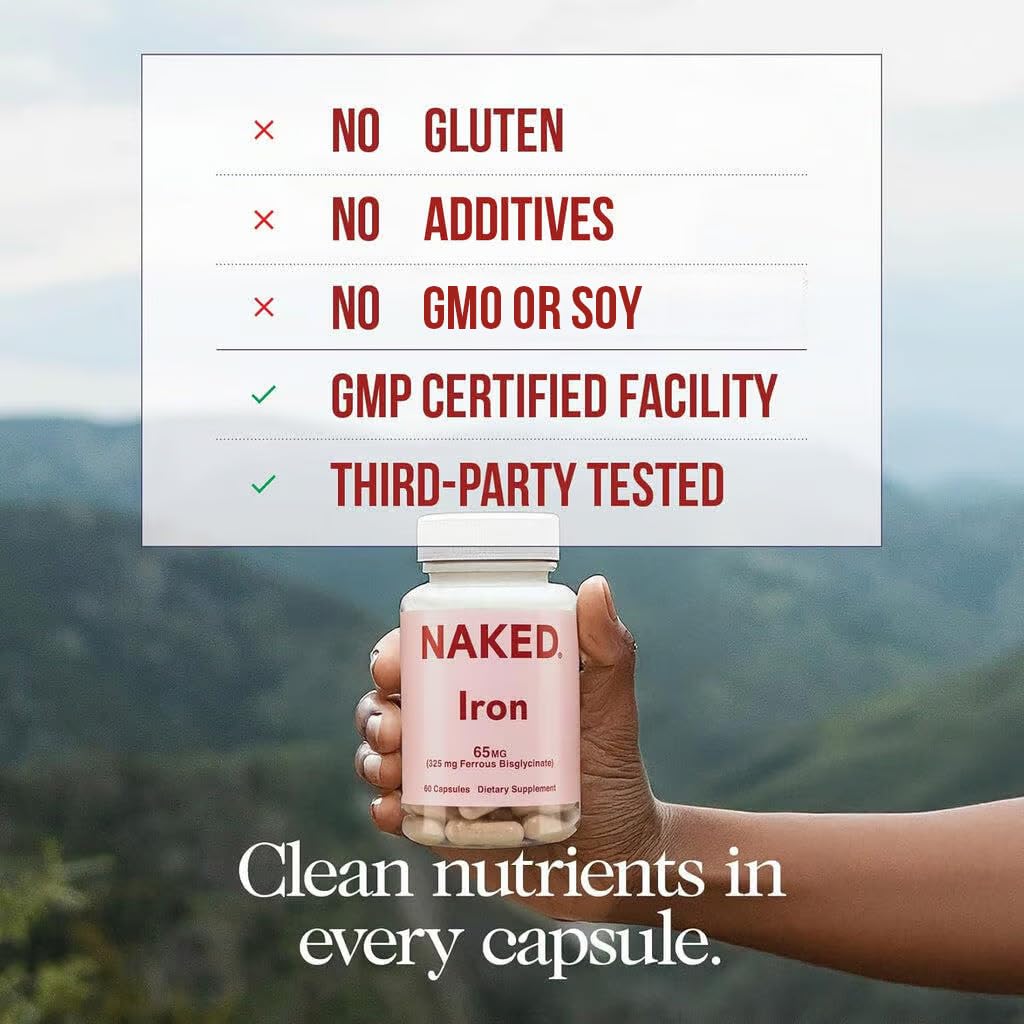 Naked Iron 65mg, 325mg Ferrous Bisglycinate - High Potency Iron Supplement for Iron Deficiency, Cellular Energy Support, Promotes Healthy Red Blood Cell Production, Non-GMO, Gluten-Free, 60 Capsules