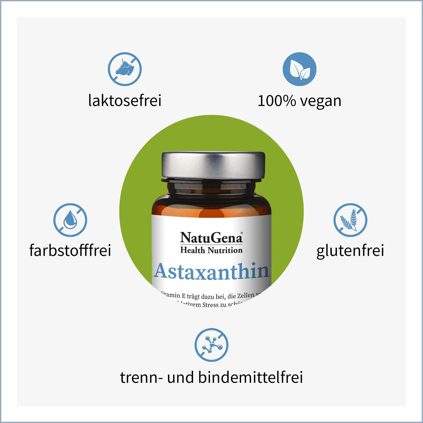 - NatuGena Astaxanthin from the natural green algae Haematococcus pluvialis with patented astafit recipe.