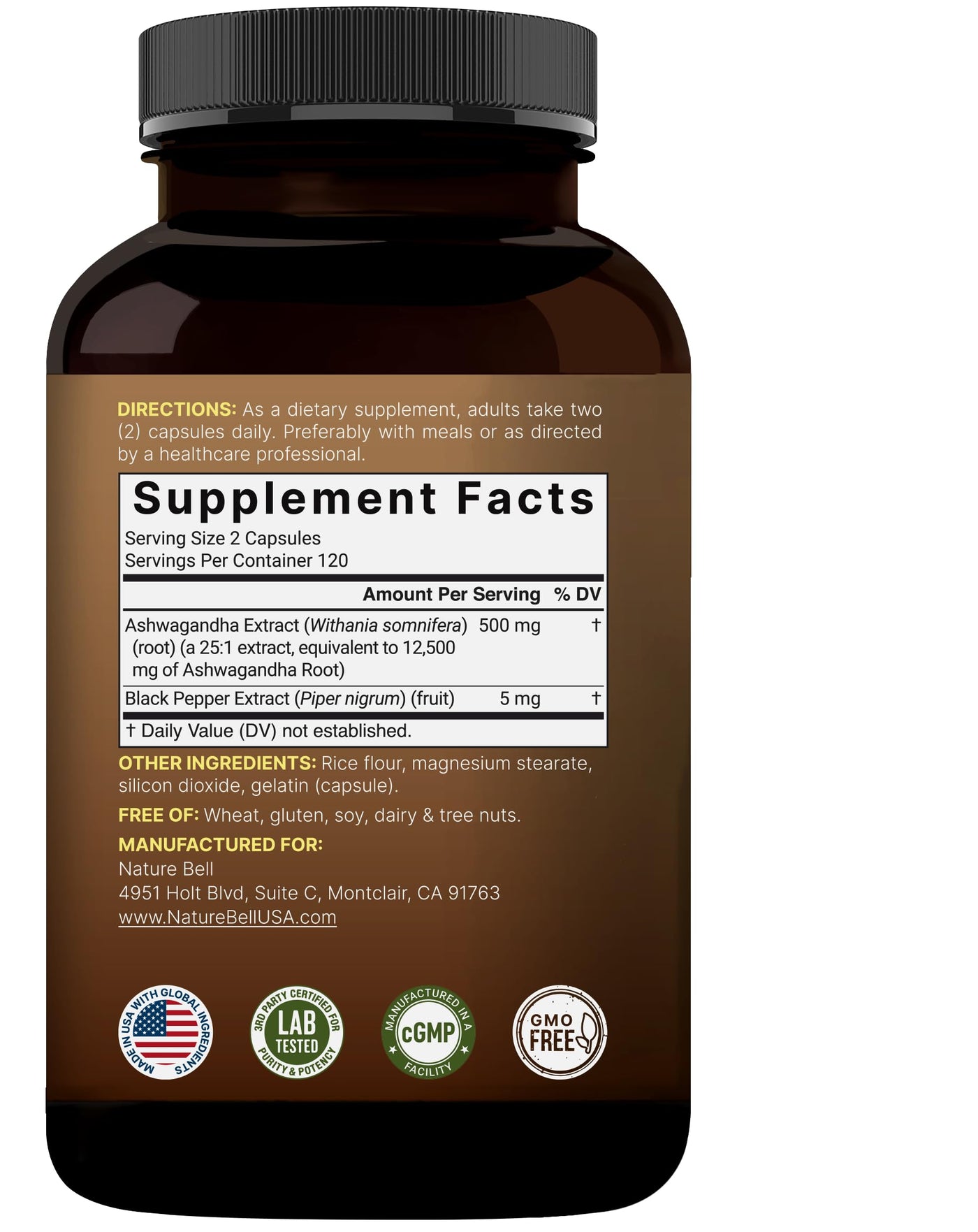 - 240 capsules per bottle, 2 capsule serving size, delivering 12,500 mg ashwagandha herbal equivalent combined with 5 mg black pepper per dose, 4-month supply.