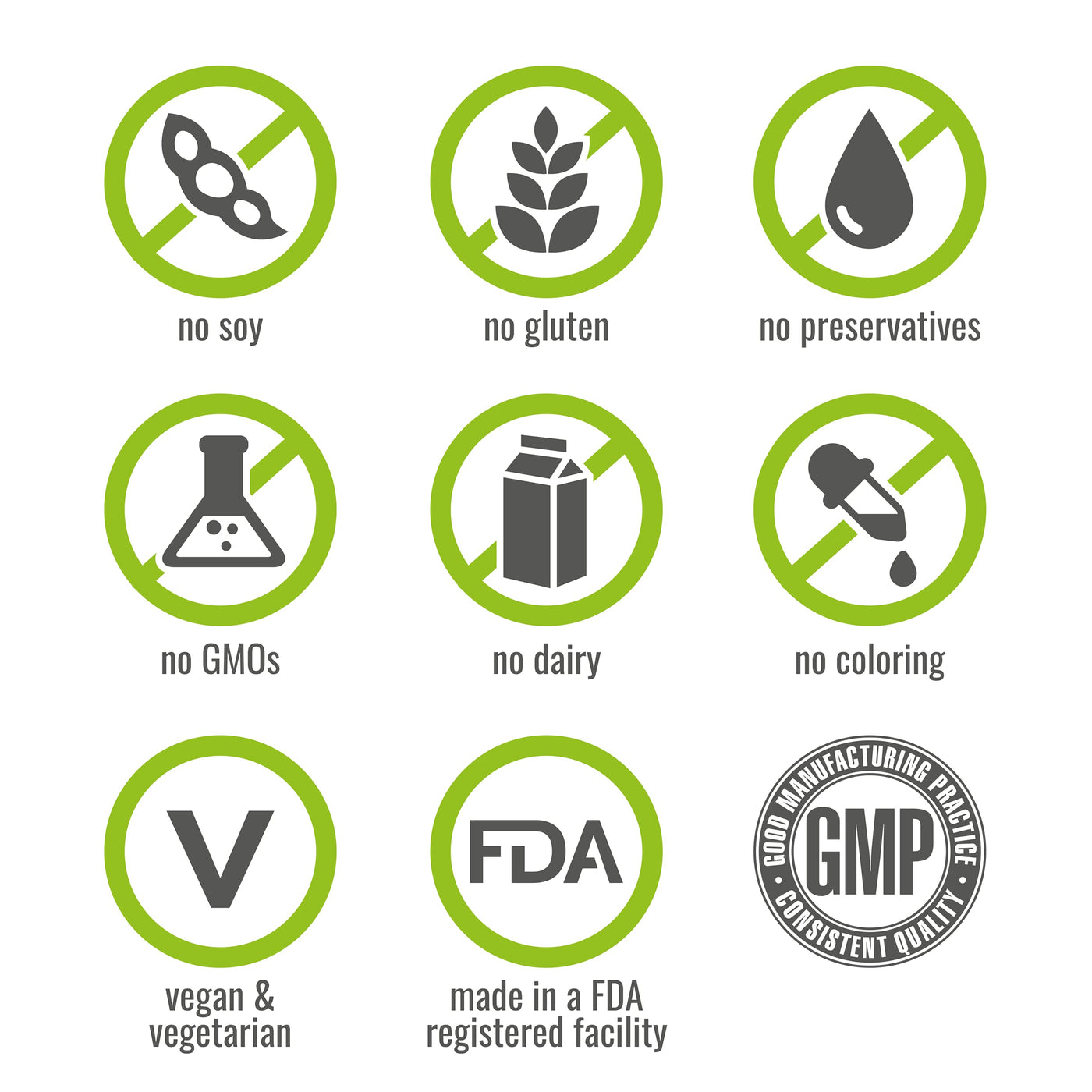 - CLEAN LABEL: No preservatives, gelatin, coloring or flavoring. Proudly made in the USA at a GMP compliant facility. Vegan, Non-GMO, and Soy Free and Gluten Free.