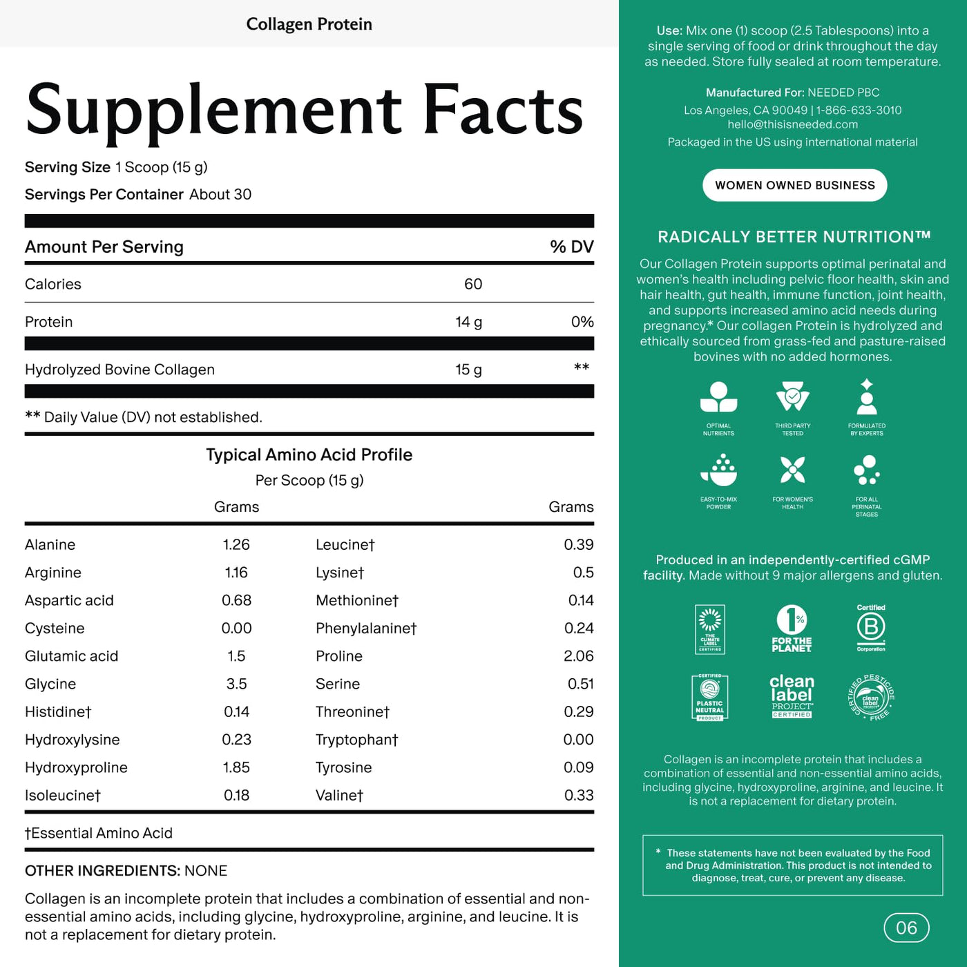 Needed. Hydrolyzed Collagen Protein Powder | Expert-Backed & Clean Sourced | Supports Skin, Hair, Joints | Grass-fed, Pasture-Raised, Hormone-Free | 1lb Unflavored