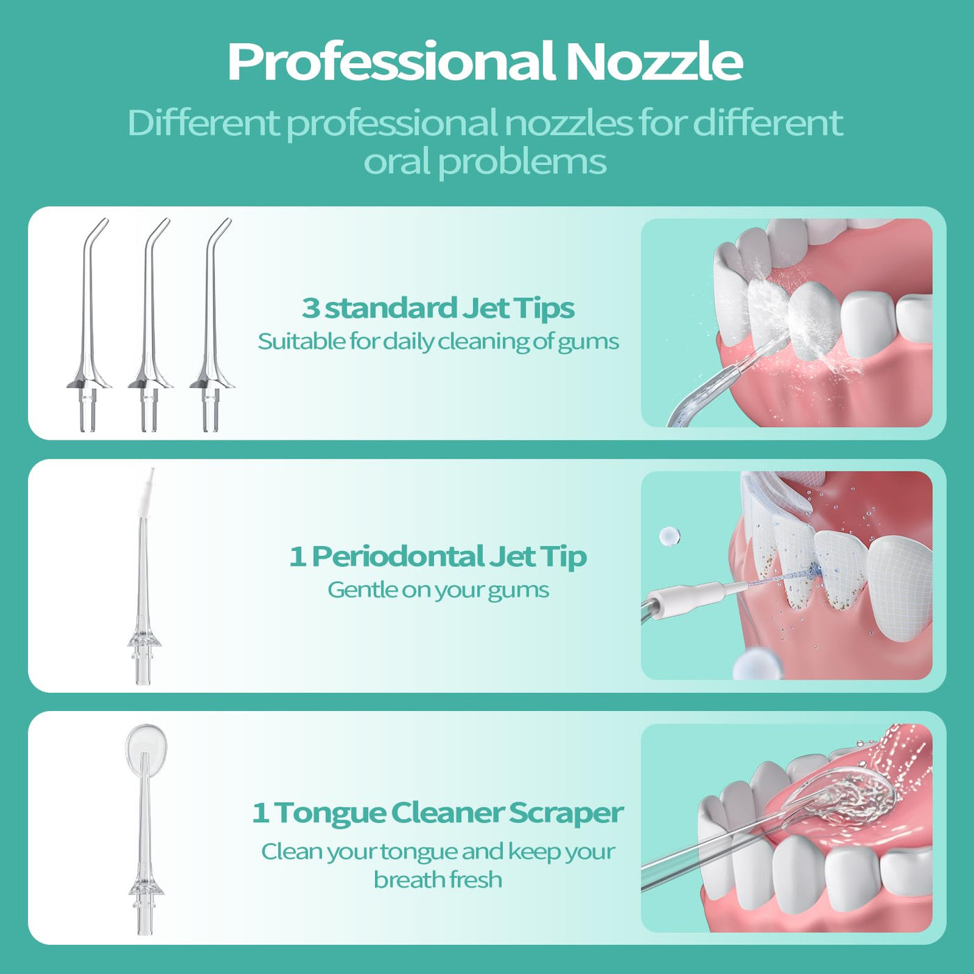 - IPX7 Waterproof Rating with 5 Replaceable Nozzles: Boasting an IPX7 waterproof rating, this flosser ensures the charging port cover is securely closed for safe use even in the shower. The water dental picks for teeth cleaning and flossing comes with 5 interchangeable nozzles that rotate 360 for effortless cleaning of every corner of your mouth. Choose the nozzle that best suits your oral condition and cleaning needs.