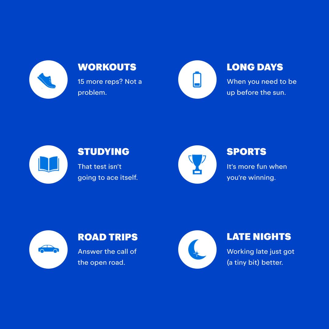 - PERFECT FOR: Anytime you need ready, reliable energylate nights, early mornings, road trips, workouts, endless to-do lists. Whenever your hands full and need a boost