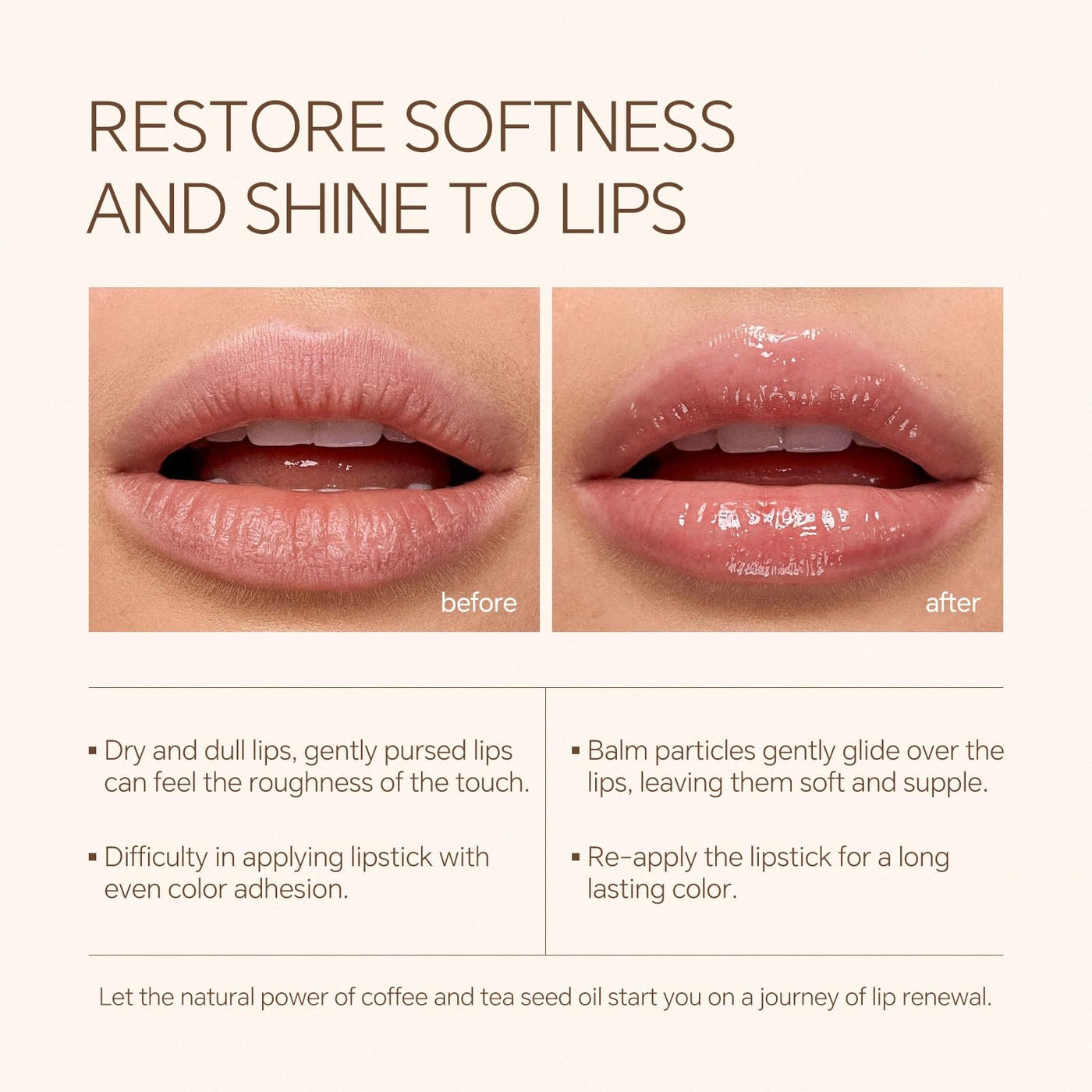 - Natural Ingredients: Coffee & Teaseed oil extract, moisturizes dry lips, they are safe, harmless, vegan cruelty-free, effectively care for your naturally beautiful lips, and keep your lips smooth and soft for longer.