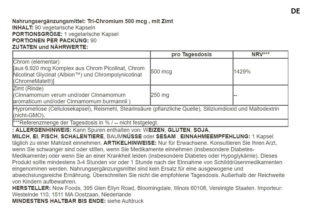 Product Description Now Foods Tri-Chromium 500mcg is a high quality Dietary supplement specifically designed to... Support blood sugar levels in the body. Each capsule contains 500mcg pure Chromium from three different chromium sources, which ensures optimal absorption and Effectiveness guaranteed. This product is ideal for people who have their Want to regulate blood sugar levels and improve your insulin sensitivity. Manufactured in a GMP certified facility, Now Foods guarantees the highest quality Quality and purity. The vegan capsule offers a simple and convenient Possibility of meeting daily chromium needs. Ingredients/Ingredients Ingredients and nutritional values per daily dose (1 capsule): Chromium (elemental) [from 6,920 mcg complex of chromium picolinate, chromium nicotinate glycinate (Albion™) and Chromium Polynicotinate (ChromeMate®)] (500 mcg) (1429%), Cinnamon (Bark) (Cinnamomum verum and/or Cinnamomum aromaticum and/or Cinnamomum burmannii) (250 mg), Hypromellose (cellulose capsule), rice flour, stearic acid (vegetable source), Silicon dioxide and maltodextrin (non-GMO) P.when('A').execute(function(A) { A.on('a:expander:toggle_description:toggle:collapse', function(data) { window.scroll(0, data.expander.$expander[0].offsetTop-100); }); }); Directions for use Take 1 capsule daily with a meal. Warnings For adults only. Consult your doctor if you are pregnant or breastfeeding if you are taking medications (especially diabetes medications) or if you have a medical condition (particularly diabetes or hypoglycemia). This product should be used at least 3-4 hours before or 1 hour taken after taking thyroid medication. Dietary supplements are not a substitute for a balanced and varied diet. Do not exceed the recommended daily dose. Keep out of the reach of children. Address Manufacturer/Importer Now Foods, 395 Glen Ellyn Road, Bloomingdale, Illinois 60108, United States. Importer: Westeinde 110, 1511 MA Oostzaan, Netherlands More