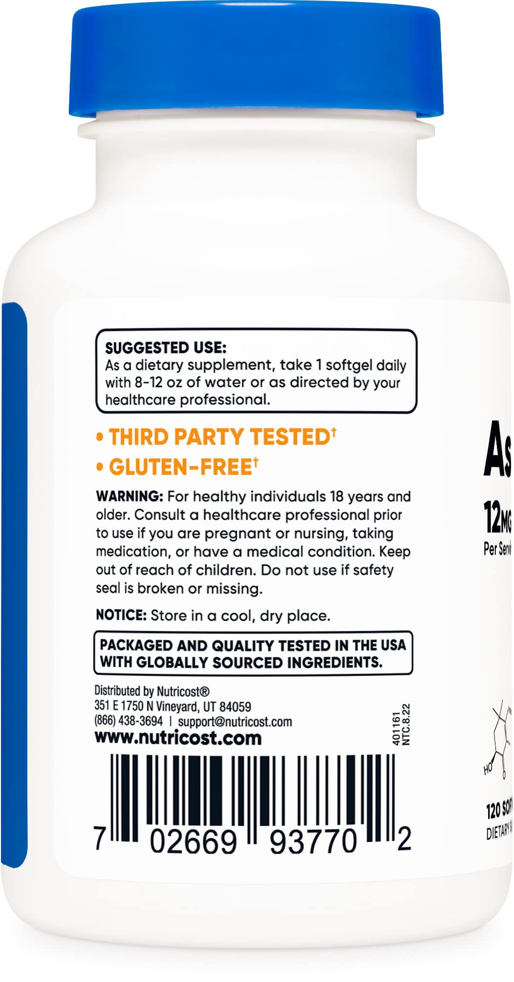 - Nutricost 12mg Astaxanthin contains 120 softgels in each bottle for a total of 120 servings.