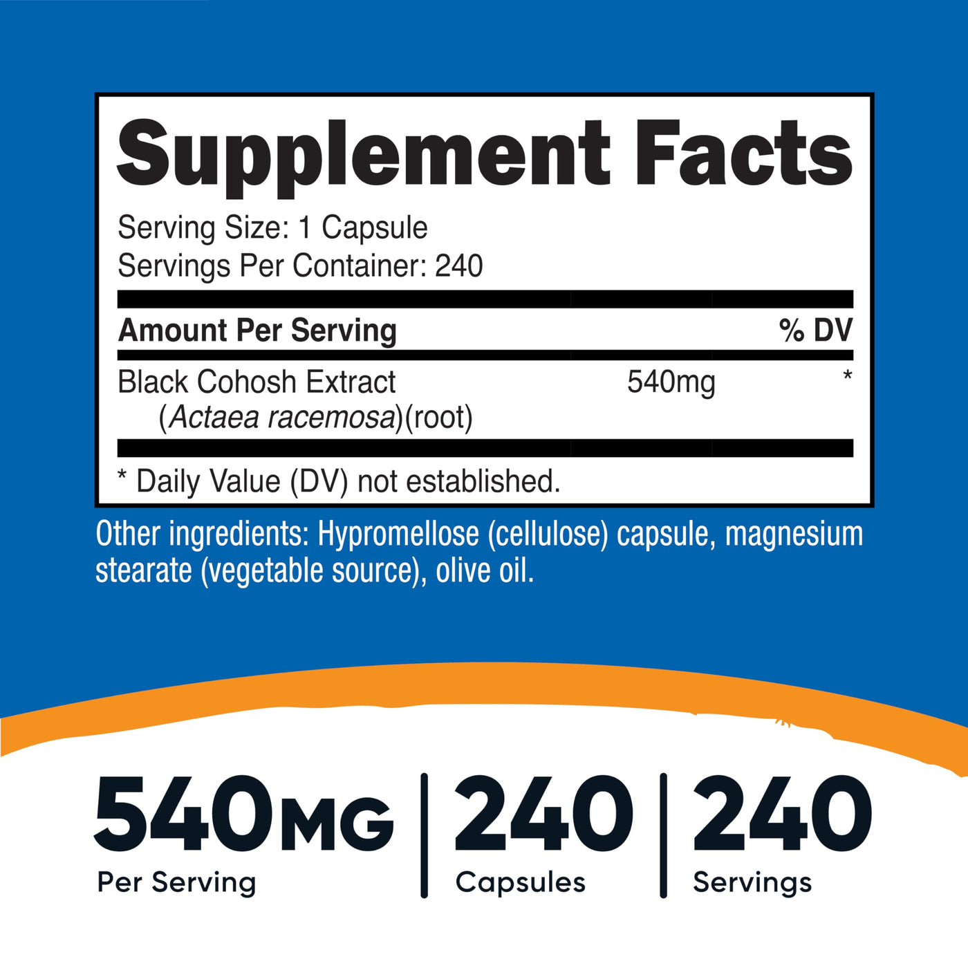 Each bottle of Nutricost Black Cohosh contains 240 servings. Each serving contains 540mg of Black Cohosh (Cimicifuga racemosa root).