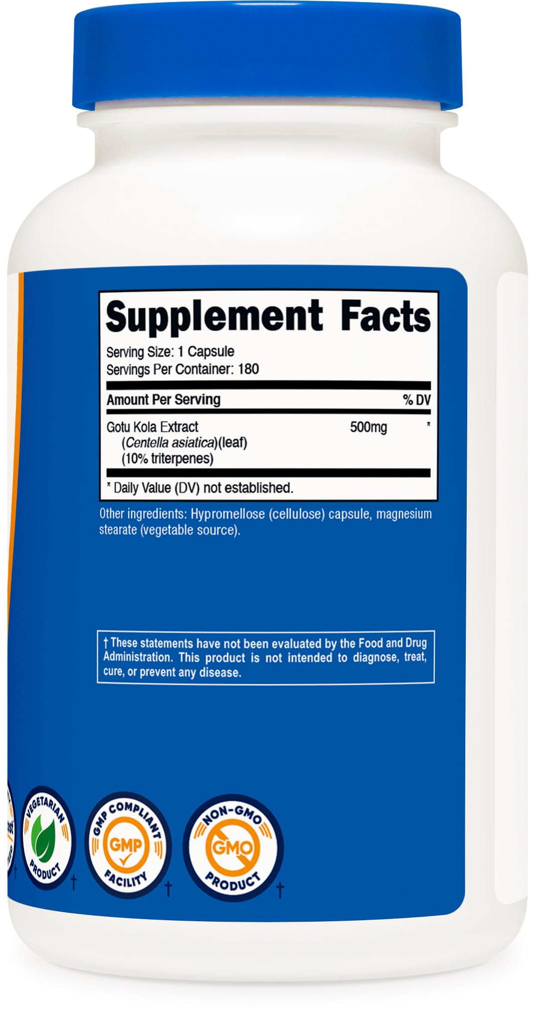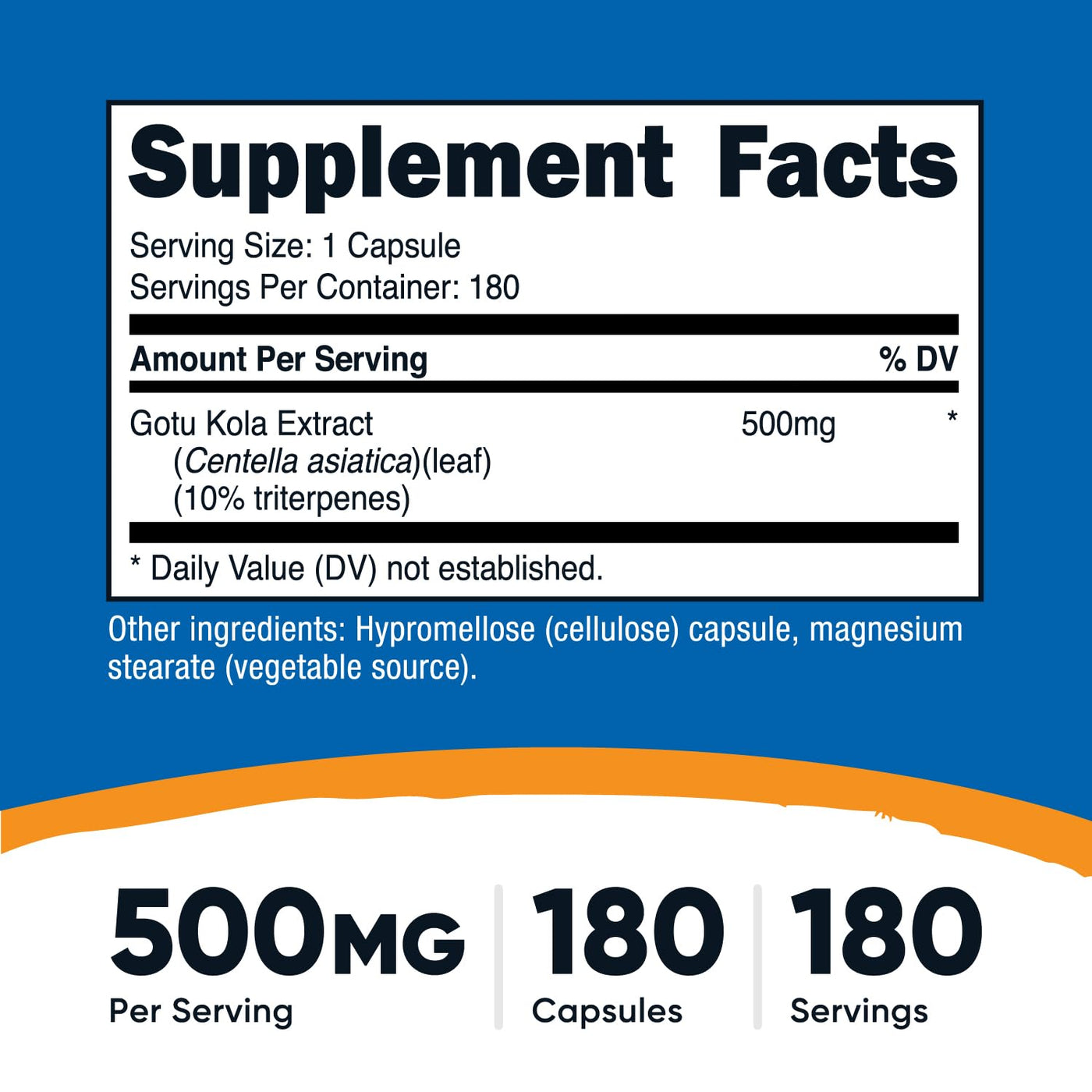 Nutricost Gotu Kola contains 180 servings with 500 milligrams of gotu kola in every capsule. They are non-gmo, gluten free, soy free, and made in a GMP compliant facility.180 Gotu Kola Capsules Per Bottle500mg Of Gotu Kola Per CapsuleOne Capsule... Nutricost Gotu Kola contains 180 servings with 500 milligrams of gotu kola in every capsule. They are non-gmo, gluten free, soy free, and made in a GMP compliant facility. 180 Gotu Kola Capsules Per Bottle 500mg Of Gotu Kola Per Capsule One Capsule Per Serving Non-GMO, Gluten Free, Soy Free Made in a GMP Compliant Facility